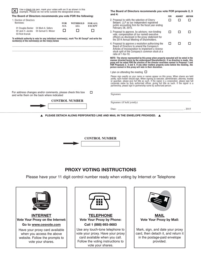 “FOR” the ratification of the selection of Cherry Bekaert LLP as our independent registered public accounting firm for our fiscal year ending February 28, 2015, referred to as “fiscal year 2015”;