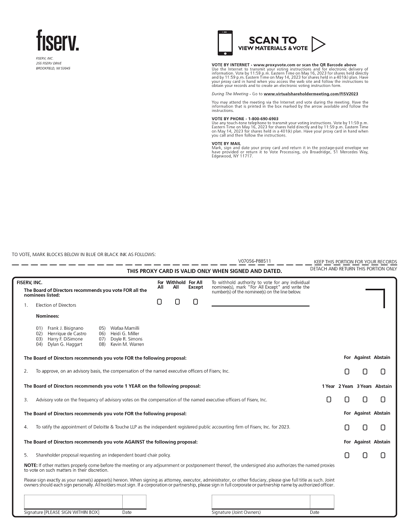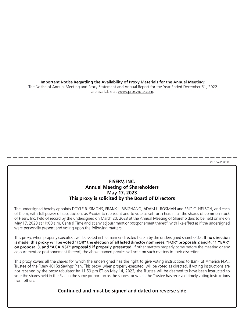 This year’s shareholders question and answer session will include questions submitted in advance of, and questions submitted live during, the annual meeting.You may submit a question in advance of the meeting at www.proxyvote.com after logging in with your 16-digit control number. Questions may be submitted during the annual meeting through www.virtualshareholdermeeting.com/FISV2023. We expect to respond to questions during the annual meeting and may also respond to questions on an individual basis or by posting answers on our Investor Relations website after the meeting.
