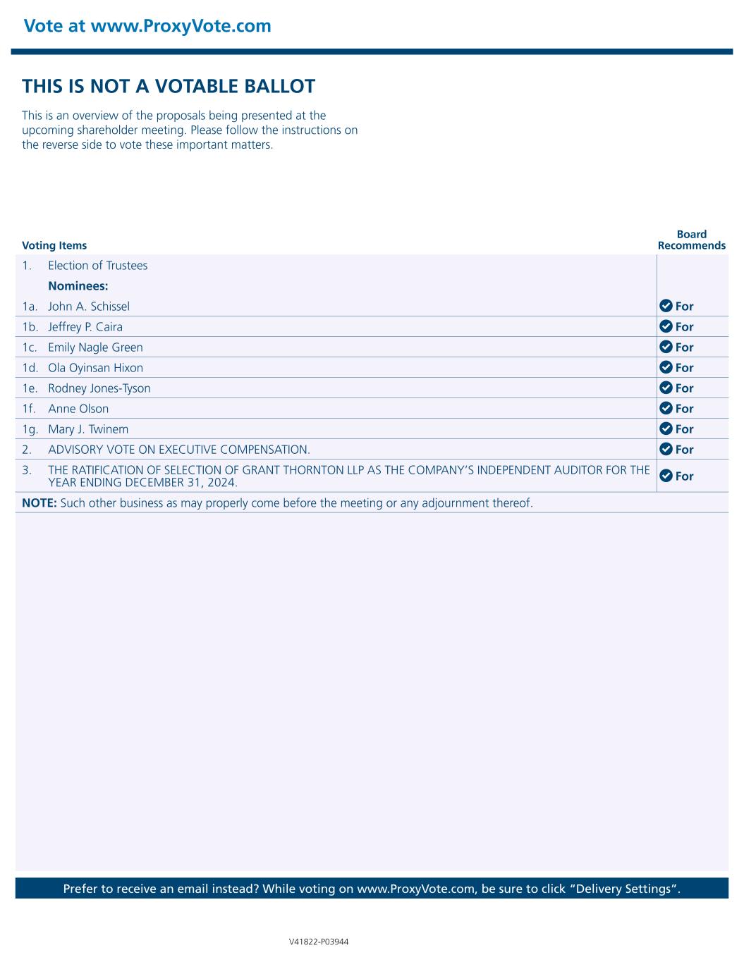 Prefer to receive an email instead? While voting on www.ProxyVote.com, be sure to click “Delivery Settings”. Voting Items Board Recommends V41822-P03944 THIS IS NOT A VOTABLE BALLOT This is an overview of the proposals being presented at the upcoming shareholder meeting. Please follow the instructions on the reverse side to vote these important matters. Vote at www.ProxyVote.com 1. Election of Trustees Nominees: 1a. John A. Schissel For 1b. Jeffrey P. Caira For 1c. Emily Nagle Green For 1d. Ola Oyinsan Hixon For 1e. Rodney Jones-Tyson For 1f. Anne Olson For 1g. Mary J. Twinem For 2. ADVISORY VOTE ON EXECUTIVE COMPENSATION. For 3. THE RATIFICATION OF SELECTION OF GRANT THORNTON LLP AS THE COMPANY’S INDEPENDENT AUDITOR FOR THE YEAR ENDING DECEMBER 31, 2024. For NOTE: Such other business as may properly come before the meeting or any adjournment thereof.