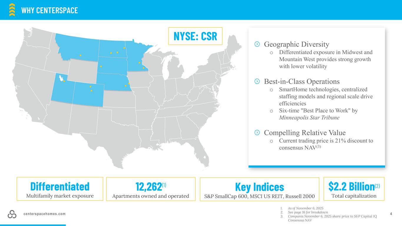 centerspacehomes.com 2 Certain statements in this presentation are based on Centerspace’s current expectations and assumptions, and are “forward-looking statements” within the meaning of the Private Securities Litigation Reform Act of 1995. Forward-looking statements do not discuss historical fact, but instead include statements related to expectations, projections, intentions, or other items related to the future. Forward-looking statements are typically identified by the use of terms such as “expects,” “anticipates,” “intends,” “plans,” “believes,” “seeks,” “estimates,” “will,” “assumes,” “may,” “projects,” “outlook,” “future,” and variations of such words and similar expressions. These forward-looking statements involve known and unknown risks, uncertainties, and other factors that may cause actual results, performance, or achievements to be materially different from the results of operations, financial conditions, or plans expressed or implied by the forward-looking statements. Although the Company believes the expectations reflected in its forward-looking statements are based upon reasonable assumptions, it can give no assurance that the expectations will be achieved. Any statements contained herein that are not statements of historical fact should be deemed forward-looking statements. As a result, reliance should not be placed on these forward-looking statements, as these statements are subject to known and unknown risks, uncertainties, and other factors beyond the Company's control and could differ materially from actual results and performance. Such risks and uncertainties are detailed from time to time in filings with the Securities and Exchange Commission (“SEC”), including the “Management’s Discussion and Analysis of Financial Condition and Results of Operations” and “Risk Factors” contained in the Company’s Annual Report on Form 10-K for the year ended December 31, 2024, in its subsequent quarterly reports on Form 10-Q, and in other reports the Company files with the SEC from time to time. The Company assumes no obligation to update or supplement forward-looking statements that become untrue due to subsequent events. SAFE HARBOR STATEMENT & LEGAL DISCLOSURES