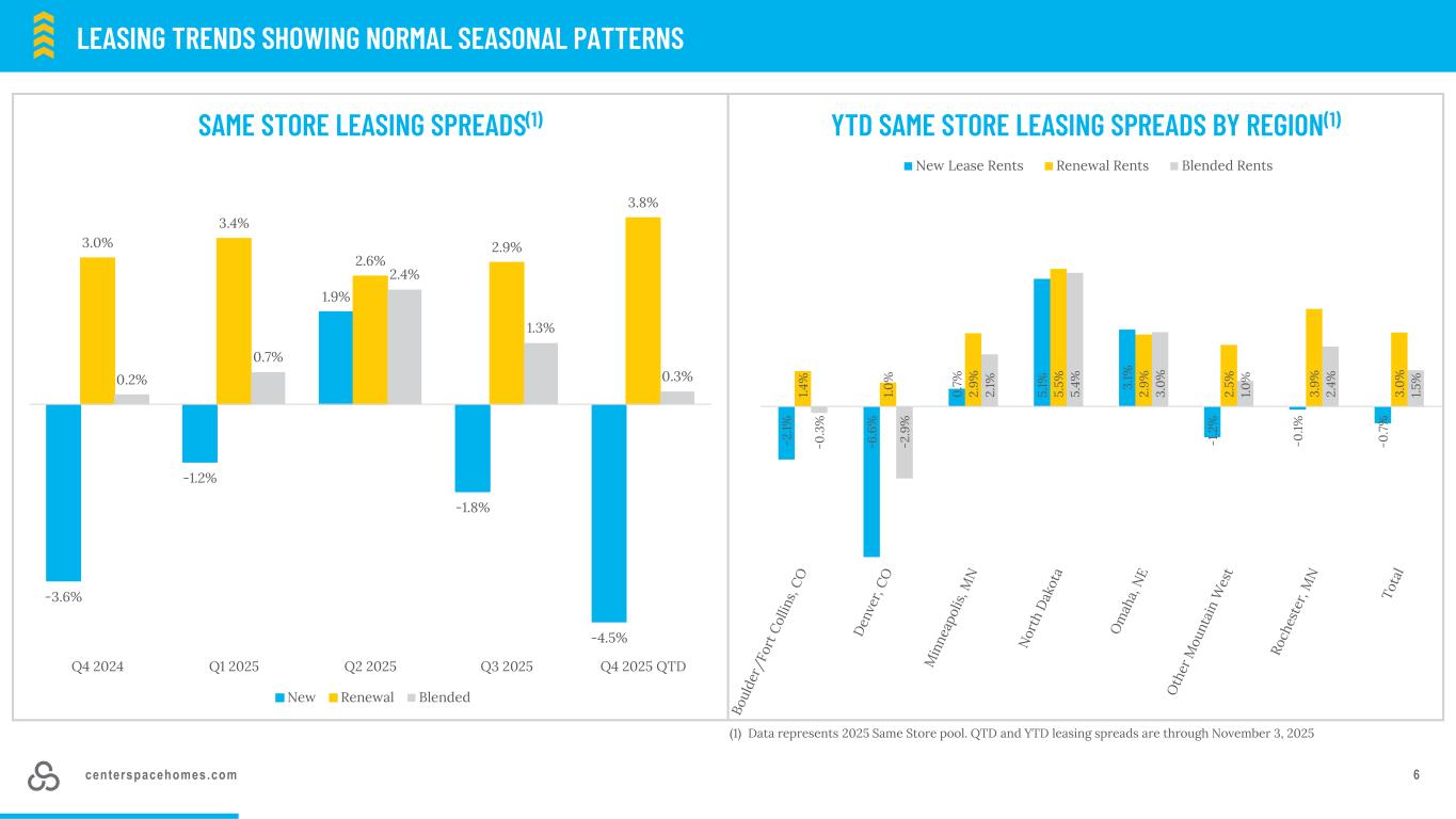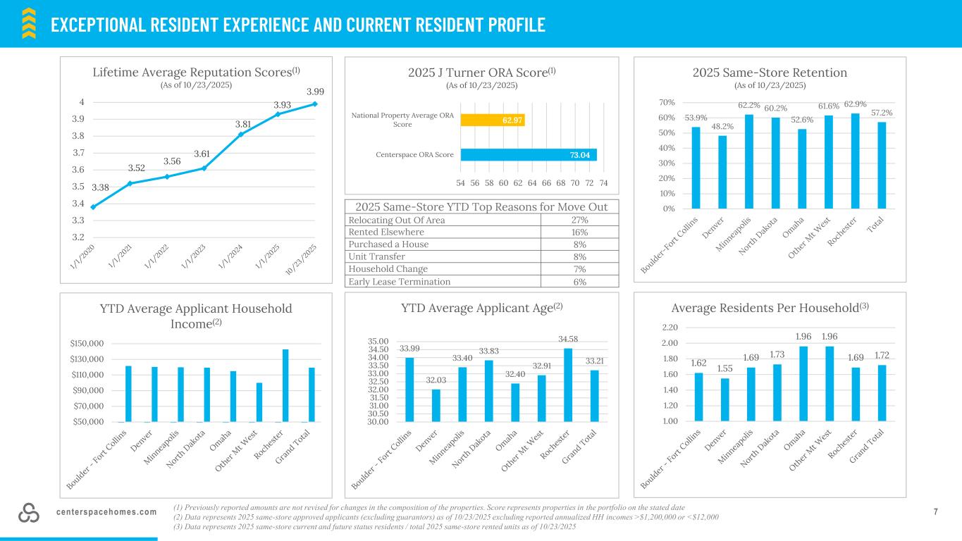 centerspacehomes.com 6 -3.6% -1.2% 1.9% -1.8% -4.5% 3.0% 3.4% 2.6% 2.9% 3.8% 0.2% 0.7% 2.4% 1.3% 0.3% Q4 2024 Q1 2025 Q2 2025 Q3 2025 Q4 2025 QTD SAME STORE LEASING SPREADS(1) New Renewal Blended -2 .1% -6 .6 % 0. 7% 5. 1% 3. 1% -1 .2 % -0 .1% -0 .7 % 1.4 % 1.0 % 2. 9% 5. 5% 2. 9% 2. 5% 3. 9% 3. 0% -0 .3 % -2 .9 % 2. 1% 5. 4% 3. 0% 1.0 % 2. 4% 1.5 % YTD SAME STORE LEASING SPREADS BY REGION(1) New Lease Rents Renewal Rents Blended Rents LEASING TRENDS SHOWING NORMAL SEASONAL PATTERNS (1) Data represents 2025 Same Store pool. QTD and YTD leasing spreads are through November 3, 2025