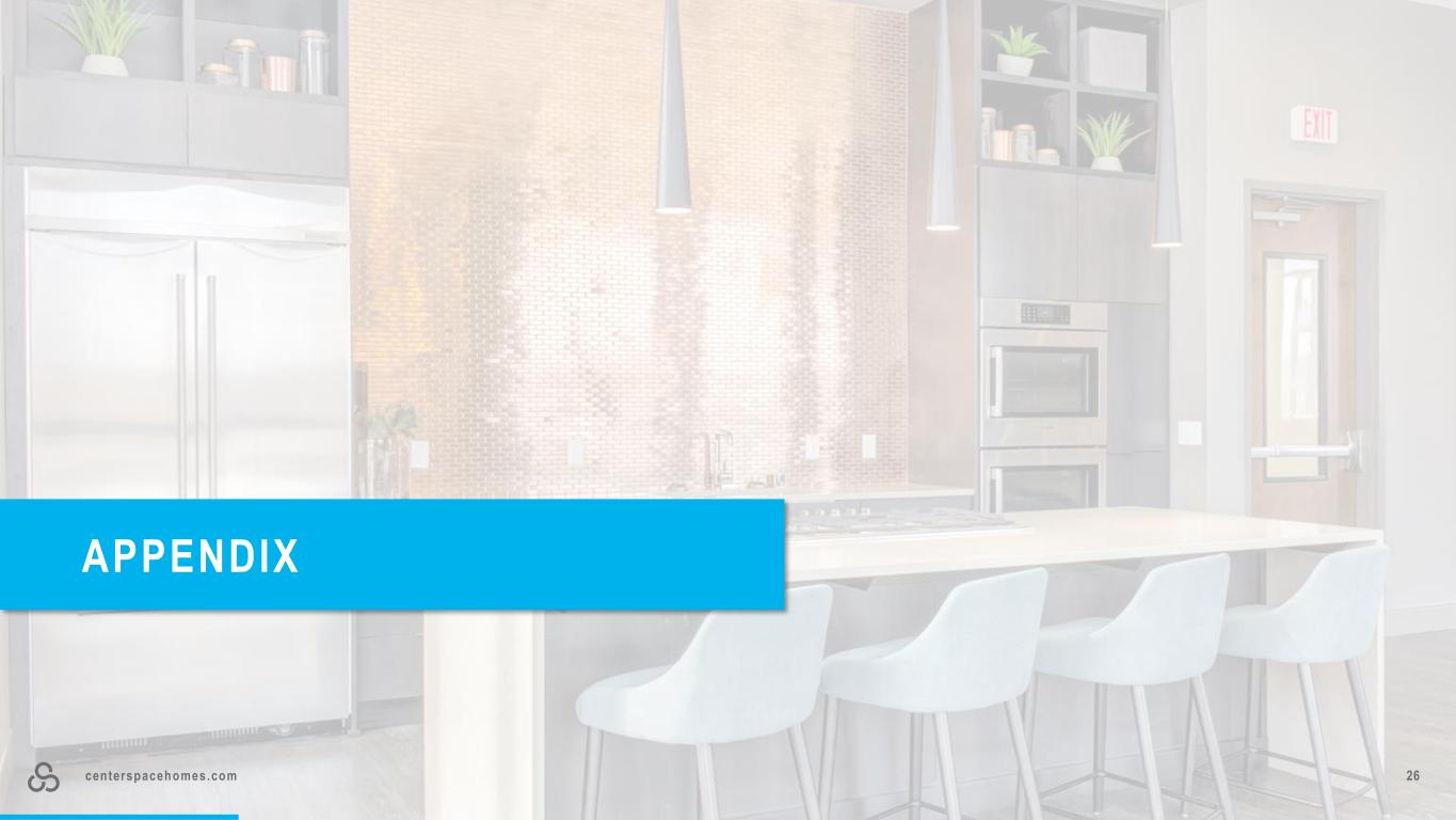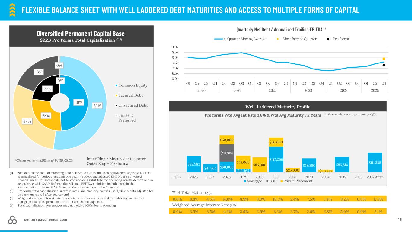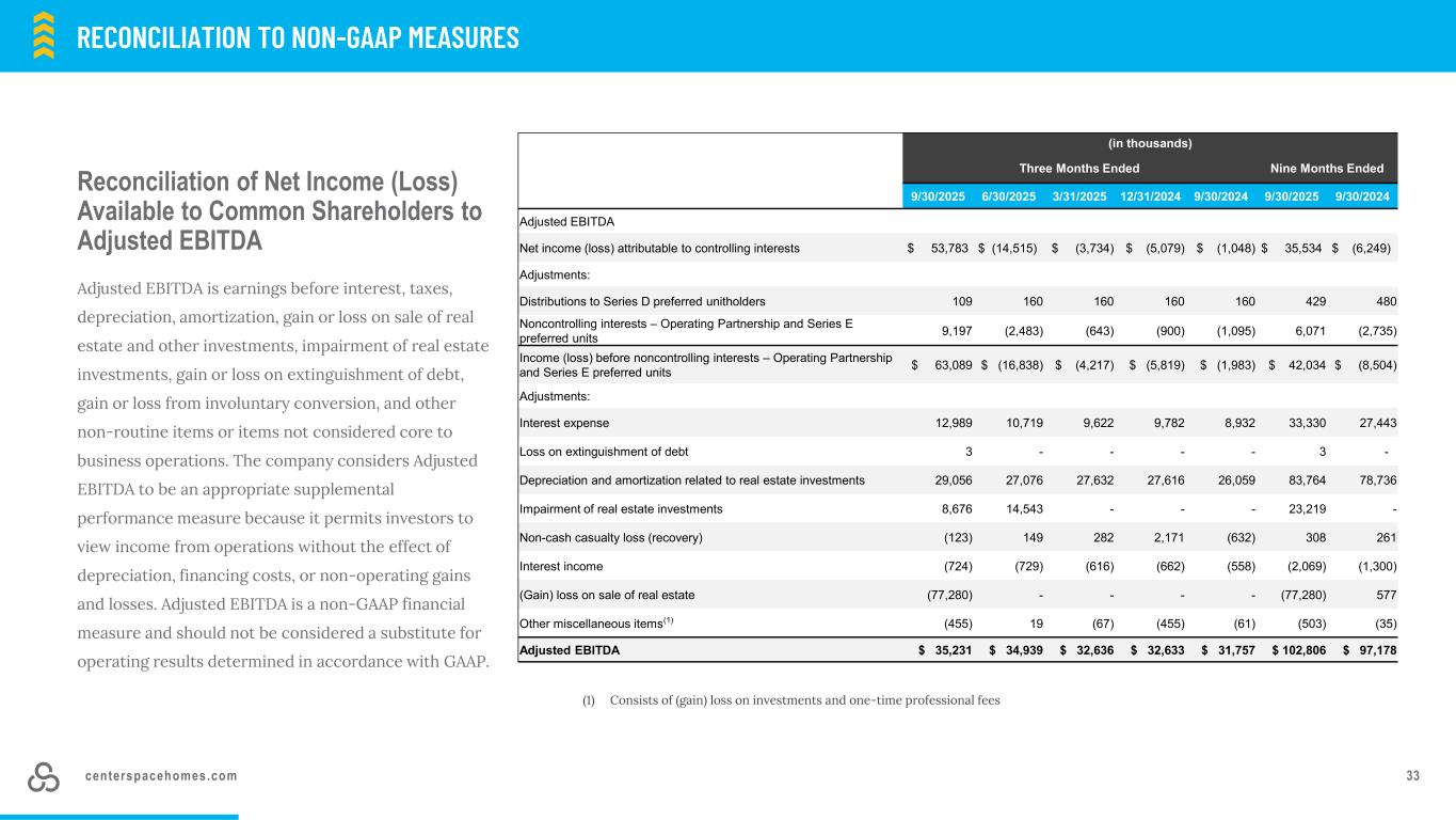 centerspacehomes.com 33 Reconciliation of Net Income (Loss) Available to Common Shareholders to Adjusted EBITDA Adjusted EBITDA is earnings before interest, taxes, depreciation, amortization, gain or loss on sale of real estate and other investments, impairment of real estate investments, gain or loss on extinguishment of debt, gain or loss from involuntary conversion, and other non-routine items or items not considered core to business operations. The company considers Adjusted EBITDA to be an appropriate supplemental performance measure because it permits investors to view income from operations without the effect of depreciation, financing costs, or non-operating gains and losses. Adjusted EBITDA is a non-GAAP financial measure and should not be considered a substitute for operating results determined in accordance with GAAP. RECONCILIATION TO NON-GAAP MEASURESRECONCILIATION TO NON-GAAP MEASURES (1) Consists of (gain) loss on investments and one-time professional fees (in thousands) Three Months Ended Nine Months Ended 9/30/2025 6/30/2025 3/31/2025 12/31/2024 9/30/2024 9/30/2025 9/30/2024 Adjusted EBITDA Net income (loss) attributable to controlling interests $ 53,783 $ (14,515) $ (3,734) $ (5,079) $ (1,048) $ 35,534 $ (6,249) Adjustments: Distributions to Series D preferred unitholders 109 160 160 160 160 429 480 Noncontrolling interests – Operating Partnership and Series E preferred units 9,197 (2,483) (643) (900) (1,095) 6,071 (2,735) Income (loss) before noncontrolling interests – Operating Partnership and Series E preferred units $ 63,089 $ (16,838) $ (4,217) $ (5,819) $ (1,983) $ 42,034 $ (8,504) Adjustments: Interest expense 12,989 10,719 9,622 9,782 8,932 33,330 27,443 Loss on extinguishment of debt 3 - - - - 3 - Depreciation and amortization related to real estate investments 29,056 27,076 27,632 27,616 26,059 83,764 78,736 Impairment of real estate investments 8,676 14,543 - - - 23,219 - Non-cash casualty loss (recovery) (123) 149 282 2,171 (632) 308 261 Interest income (724) (729) (616) (662) (558) (2,069) (1,300) (Gain) loss on sale of real estate (77,280) - - - - (77,280) 577 Other miscellaneous items(1) (455) 19 (67) (455) (61) (503) (35) Adjusted EBITDA $ 35,231 $ 34,939 $ 32,636 $ 32,633 $ 31,757 $ 102,806 $ 97,178