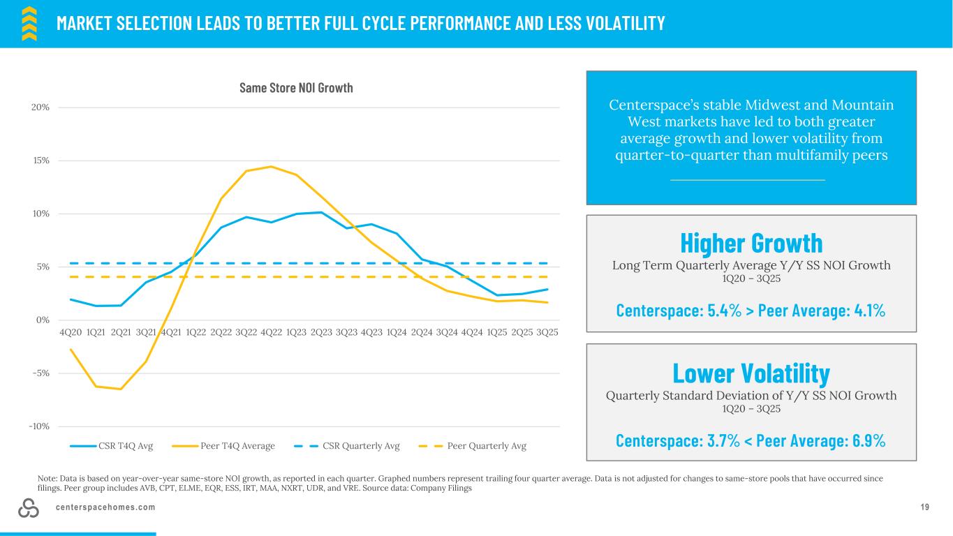 centerspacehomes.com 18Parkhouse Apartment Homes – Thornton, CO GEOGRAPHIC FOCUS (% OF UNITS) Source: S&P Capital IQ Notes: As of 10/21/25. CSR pro forma for 2025 acquisitions and dispositions. Rounding may result in each row not adding to 100% ENHANCED GEOGRAPHIC DIFFERENTIATION THROUGH IMPROVED MARKET EXPOSURES PUBLIC MULTIFAMILY REIT MARKET OVERVIEW 33% 3% 6% 5% 4% 67% 21% 5% 41% 48% 4% 100% 27% 14% 24% 10% 10% 85% 34% 71% 75% 25% 76% 92% 17% 17% 7% 21% 10% 6% 75% 3% 28% 18% 17% 94% Mountain West Midwest West Southeast & Texas Mid-Atlantic Northeast