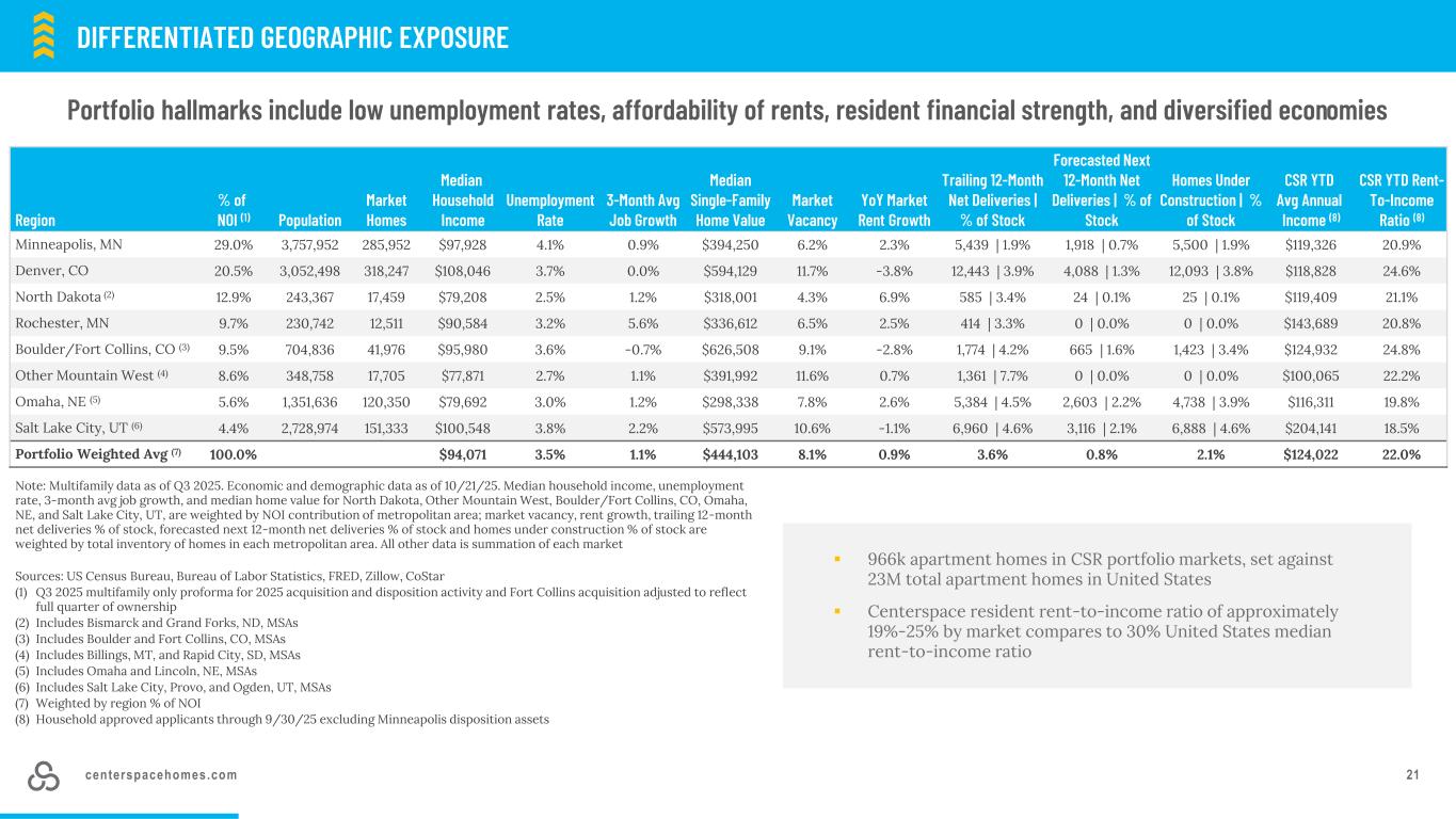centerspacehomes.com 20 OUR MARKET EXPOSURES BRING MORE DEMOGRAPHIC AND ECONOMIC OPPORTUNITIES Higher Employment Growth 4Q24 – 4Q30, Cumulative Centerspace: 3.5% > US Average: 2.8% Higher Household Growth 4Q24 – 4Q30, Cumulative Centerspace: 5.7% > US Average: 3.8% Source: CoStar Note: Combined CSR Markets data based on all MSAs in which Centerspace operates adjusted for recent acquisitions and planned dispositions. Household Growth and Employment Growth data is based on CoStar figures as of October 24, 2025 99 100 101 102 103 104 105 106 107 2024 Q4 2025 Q4 2026 Q4 2027 Q4 2028 Q4 2029 Q4 2030 Q4 Employment Growth (Indexed Values: Q4 2024=100) Denver Minneapolis Salt Lake City Centerspace Portfolio US Average 99 100 101 102 103 104 105 106 107 108 2024 Q4 2025 Q4 2026 Q4 2027 Q4 2028 Q4 2029 Q4 2030 Q4 Household Growth (Indexed Values: Q4 2024=100) Denver Minneapolis Salt Lake City Centerspace Portfolio US Average