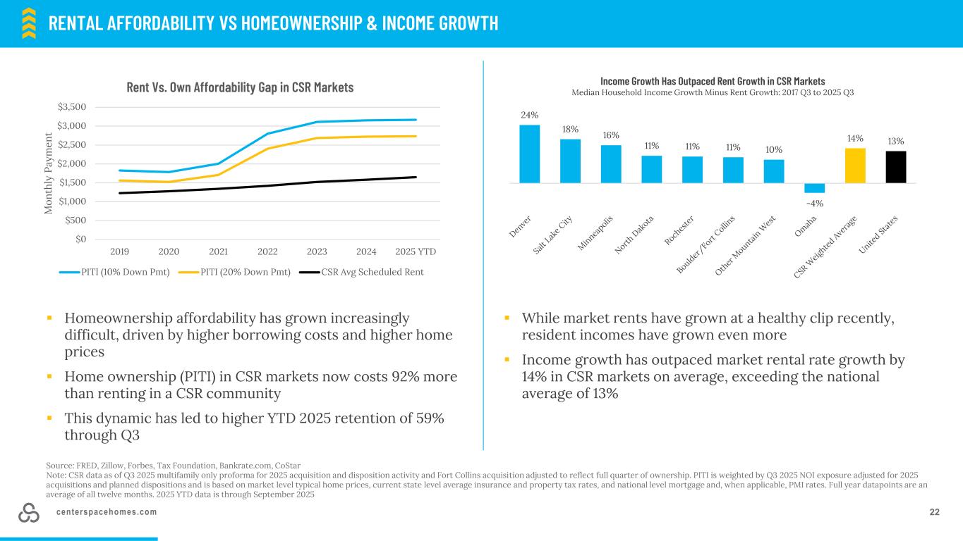 centerspacehomes.com 21 Region % of NOI (1) Population Market Homes Median Household Income Unemployment Rate 3-Month Avg Job Growth Median Single-Family Home Value Market Vacancy YoY Market Rent Growth Trailing 12-Month Net Deliveries | % of Stock Forecasted Next 12-Month Net Deliveries | % of Stock Homes Under Construction | % of Stock CSR YTD Avg Annual Income (8) CSR YTD Rent- To-Income Ratio (8) Minneapolis, MN 29.0% 3,757,952 285,952 $97,928 4.1% 0.9% $394,250 6.2% 2.3% 5,439 | 1.9% 1,918 | 0.7% 5,500 | 1.9% $119,326 20.9% Denver, CO 20.5% 3,052,498 318,247 $108,046 3.7% 0.0% $594,129 11.7% -3.8% 12,443 | 3.9% 4,088 | 1.3% 12,093 | 3.8% $118,828 24.6% North Dakota (2) 12.9% 243,367 17,459 $79,208 2.5% 1.2% $318,001 4.3% 6.9% 585 | 3.4% 24 | 0.1% 25 | 0.1% $119,409 21.1% Rochester, MN 9.7% 230,742 12,511 $90,584 3.2% 5.6% $336,612 6.5% 2.5% 414 | 3.3% 0 | 0.0% 0 | 0.0% $143,689 20.8% Boulder/Fort Collins, CO (3) 9.5% 704,836 41,976 $95,980 3.6% -0.7% $626,508 9.1% -2.8% 1,774 | 4.2% 665 | 1.6% 1,423 | 3.4% $124,932 24.8% Other Mountain West (4) 8.6% 348,758 17,705 $77,871 2.7% 1.1% $391,992 11.6% 0.7% 1,361 | 7.7% 0 | 0.0% 0 | 0.0% $100,065 22.2% Omaha, NE (5) 5.6% 1,351,636 120,350 $79,692 3.0% 1.2% $298,338 7.8% 2.6% 5,384 | 4.5% 2,603 | 2.2% 4,738 | 3.9% $116,311 19.8% Salt Lake City, UT (6) 4.4% 2,728,974 151,333 $100,548 3.8% 2.2% $573,995 10.6% -1.1% 6,960 | 4.6% 3,116 | 2.1% 6,888 | 4.6% $204,141 18.5% Portfolio Weighted Avg (7) 100.0% $94,071 3.5% 1.1% $444,103 8.1% 0.9% 3.6% 0.8% 2.1% $124,022 22.0% Note: Multifamily data as of Q3 2025. Economic and demographic data as of 10/21/25. Median household income, unemployment rate, 3-month avg job growth, and median home value for North Dakota, Other Mountain West, Boulder/Fort Collins, CO, Omaha, NE, and Salt Lake City, UT, are weighted by NOI contribution of metropolitan area; market vacancy, rent growth, trailing 12-month net deliveries % of stock, forecasted next 12-month net deliveries % of stock and homes under construction % of stock are weighted by total inventory of homes in each metropolitan area. All other data is summation of each market Sources: US Census Bureau, Bureau of Labor Statistics, FRED, Zillow, CoStar (1) Q3 2025 multifamily only proforma for 2025 acquisition and disposition activity and Fort Collins acquisition adjusted to reflect full quarter of ownership (2) Includes Bismarck and Grand Forks, ND, MSAs (3) Includes Boulder and Fort Collins, CO, MSAs (4) Includes Billings, MT, and Rapid City, SD, MSAs (5) Includes Omaha and Lincoln, NE, MSAs (6) Includes Salt Lake City, Provo, and Ogden, UT, MSAs (7) Weighted by region % of NOI (8) Household approved applicants through 9/30/25 excluding Minneapolis disposition assets INNOVATION – PROVIDING DIFFERENTIATED EXPOSURE ▪ 966k apartment homes in CSR portfolio markets, set against 23M total apartment homes in United States ▪ Centerspace resident rent-to-income ratio of approximately 19%-25% by market compares to 30% United States median rent-to-income ratio DIFFERENTIATED GEOGRAPHIC EXPOSURE Portfolio hallmarks include low unemployment rates, affordability of rents, resident financial strength, and diversified economies