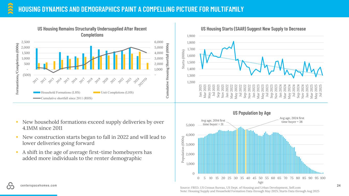 centerspacehomes.com GEOGRAPHIC DIFFERENTIATION HOUSING DYNAMICS AND DEMOGRAPHICS PAINT A COMPELLING PICTURE FOR MULTIFAMILY PROVEN EXECUTION 24 ▪ New household formations exceed supply deliveries by over 4.1MM since 2011 ▪ New construction starts began to fall in 2022 and will lead to lower deliveries going forward ▪ A shift in the age of average first-time homebuyers has added more individuals to the renter demographic Source: FRED, US Census Bureau, US Dept. of Housing and Urban Development, Self.com Note: Housing Supply and Household Formation Data through May 2025; Starts Data through Aug 2025 Avg age, 2014 first time buyer = 31 Avg age, 2024 first time buyer = 38 0 1,000 2,000 3,000 4,000 5,000 0 5 10 15 20 25 30 35 40 45 50 55 60 65 70 75 80 85 90 95 100 Po pu la ti on (0 00 s) Age US Population by Age - 1,000 2,000 3,000 4,000 5,000 6,000 (500) - 500 1,000 1,500 2,000 2,500 C um ul at iv e H ou si ng S ho rt fa ll (0 00 s) Fo rm an ti on s/ C om pl et io ns (0 00 s) US Housing Remains Structurally Undersupplied After Recent Completions Household Formations (LHS) Unit Completions (LHS) Cumulative shortfall since 2011 (RHS) 1,200 1,300 1,400 1,500 1,600 1,700 1,800 1,900 Ja n 20 21 M ar 2 02 1 M ay 2 02 1 Ju l 2 02 1 Se p 20 21 N ov 2 02 1 Ja n 20 22 M ar 2 02 2 M ay 2 02 2 Ju l 2 02 2 Se p 20 22 N ov 2 02 2 Ja n 20 23 M ar 2 02 3 M ay 2 02 3 Ju l 2 02 3 Se p 20 23 N ov 2 02 3 Ja n 20 24 M ar 2 02 4 M ay 2 02 4 Ju l 2 02 4 Se p 20 24 N ov 2 02 4 Ja n 20 25 M ar 2 02 5 M ay 2 02 5 Ju l 2 02 5 St ar ts (0 00 s) US Housing Starts (SAAR) Suggest New Supply to Decrease