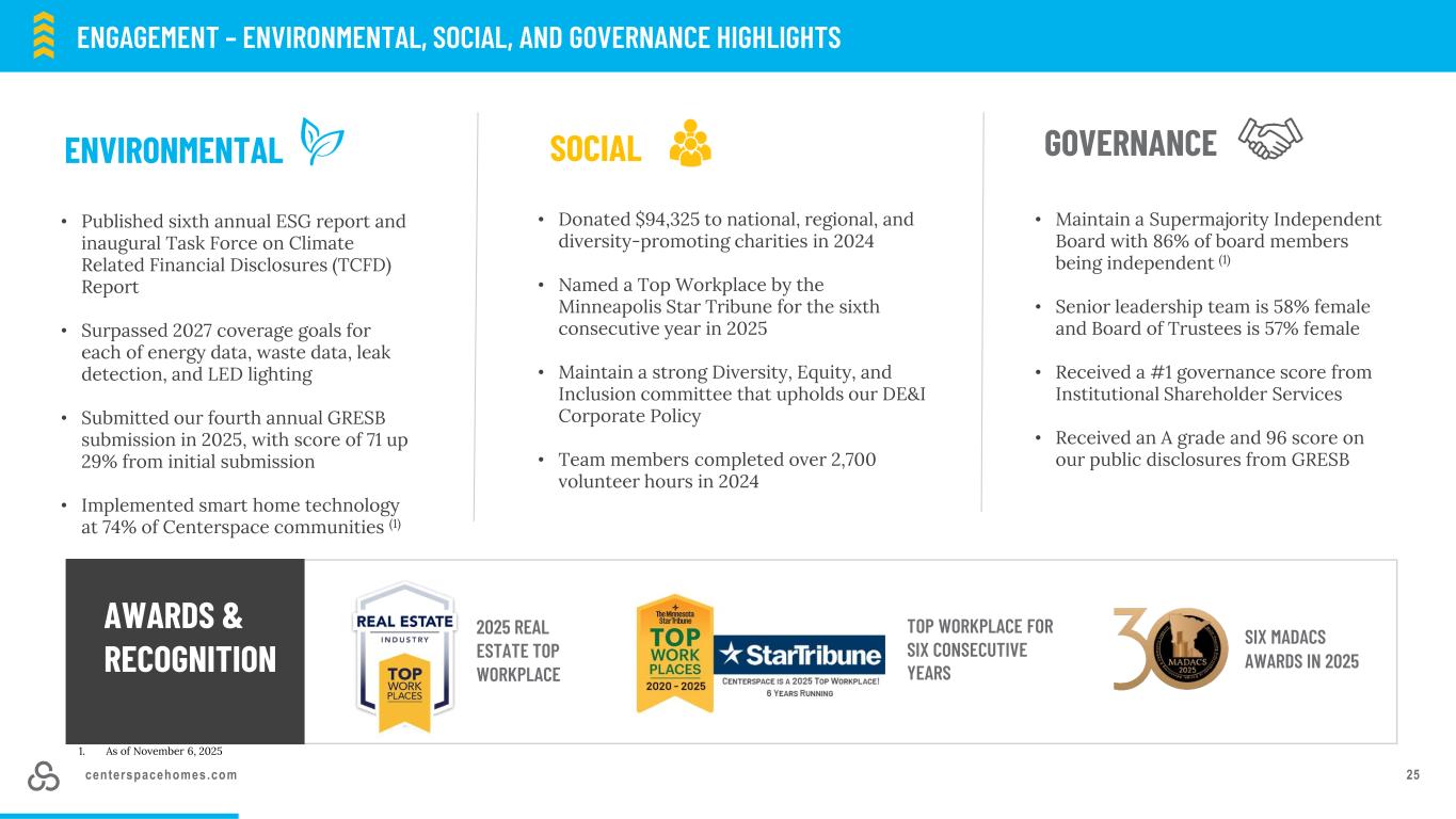 centerspacehomes.com 25 ENVIRONMENTAL SOCIAL GOVERNANCE • Published sixth annual ESG report and inaugural Task Force on Climate Related Financial Disclosures (TCFD) Report • Surpassed 2027 coverage goals for each of energy data, waste data, leak detection, and LED lighting • Submitted our fourth annual GRESB submission in 2025, with score of 71 up 29% from initial submission • Implemented smart home technology at 74% of Centerspace communities (1) • Maintain a Supermajority Independent Board with 86% of board members being independent (1) • Senior leadership team is 58% female and Board of Trustees is 57% female • Received a #1 governance score from Institutional Shareholder Services • Received an A grade and 96 score on our public disclosures from GRESB • Donated $94,325 to national, regional, and diversity-promoting charities in 2024 • Named a Top Workplace by the Minneapolis Star Tribune for the sixth consecutive year in 2025 • Maintain a strong Diversity, Equity, and Inclusion committee that upholds our DE&I Corporate Policy • Team members completed over 2,700 volunteer hours in 2024 2025 REAL ESTATE TOP WORKPLACE TOP WORKPLACE FOR SIX CONSECUTIVE YEARS SIX MADACS AWARDS IN 2025 ENGAGEMENT – ENVIRONMENTAL, SOCIAL, AND GOVERNANCE HIGHLIGHTS AWARDS & RECOGNITION 1. As of November 6, 2025