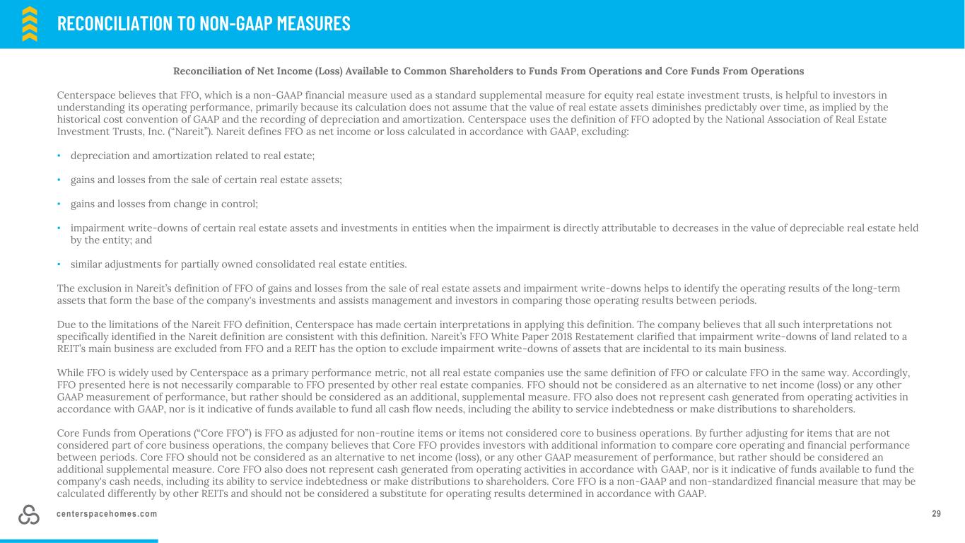 centerspacehomes.com 29 RECONCILIATION TO NON-GAAP MEASURES Reconciliation of Net Income (Loss) Available to Common Shareholders to Funds From Operations and Core Funds From Operations Centerspace believes that FFO, which is a non-GAAP financial measure used as a standard supplemental measure for equity real estate investment trusts, is helpful to investors in understanding its operating performance, primarily because its calculation does not assume that the value of real estate assets diminishes predictably over time, as implied by the historical cost convention of GAAP and the recording of depreciation and amortization. Centerspace uses the definition of FFO adopted by the National Association of Real Estate Investment Trusts, Inc. (“Nareit”). Nareit defines FFO as net income or loss calculated in accordance with GAAP, excluding: • depreciation and amortization related to real estate; • gains and losses from the sale of certain real estate assets; • gains and losses from change in control; • impairment write-downs of certain real estate assets and investments in entities when the impairment is directly attributable to decreases in the value of depreciable real estate held by the entity; and • similar adjustments for partially owned consolidated real estate entities. The exclusion in Nareit’s definition of FFO of gains and losses from the sale of real estate assets and impairment write-downs helps to identify the operating results of the long-term assets that form the base of the company's investments and assists management and investors in comparing those operating results between periods. Due to the limitations of the Nareit FFO definition, Centerspace has made certain interpretations in applying this definition. The company believes that all such interpretations not specifically identified in the Nareit definition are consistent with this definition. Nareit’s FFO White Paper 2018 Restatement clarified that impairment write-downs of land related to a REIT’s main business are excluded from FFO and a REIT has the option to exclude impairment write-downs of assets that are incidental to its main business. While FFO is widely used by Centerspace as a primary performance metric, not all real estate companies use the same definition of FFO or calculate FFO in the same way. Accordingly, FFO presented here is not necessarily comparable to FFO presented by other real estate companies. FFO should not be considered as an alternative to net income (loss) or any other GAAP measurement of performance, but rather should be considered as an additional, supplemental measure. FFO also does not represent cash generated from operating activities in accordance with GAAP, nor is it indicative of funds available to fund all cash flow needs, including the ability to service indebtedness or make distributions to shareholders. Core Funds from Operations (“Core FFO”) is FFO as adjusted for non-routine items or items not considered core to business operations. By further adjusting for items that are not considered part of core business operations, the company believes that Core FFO provides investors with additional information to compare core operating and financial performance between periods. Core FFO should not be considered as an alternative to net income (loss), or any other GAAP measurement of performance, but rather should be considered an additional supplemental measure. Core FFO also does not represent cash generated from operating activities in accordance with GAAP, nor is it indicative of funds available to fund the company's cash needs, including its ability to service indebtedness or make distributions to shareholders. Core FFO is a non-GAAP and non-standardized financial measure that may be calculated differently by other REITs and should not be considered a substitute for operating results determined in accordance with GAAP.