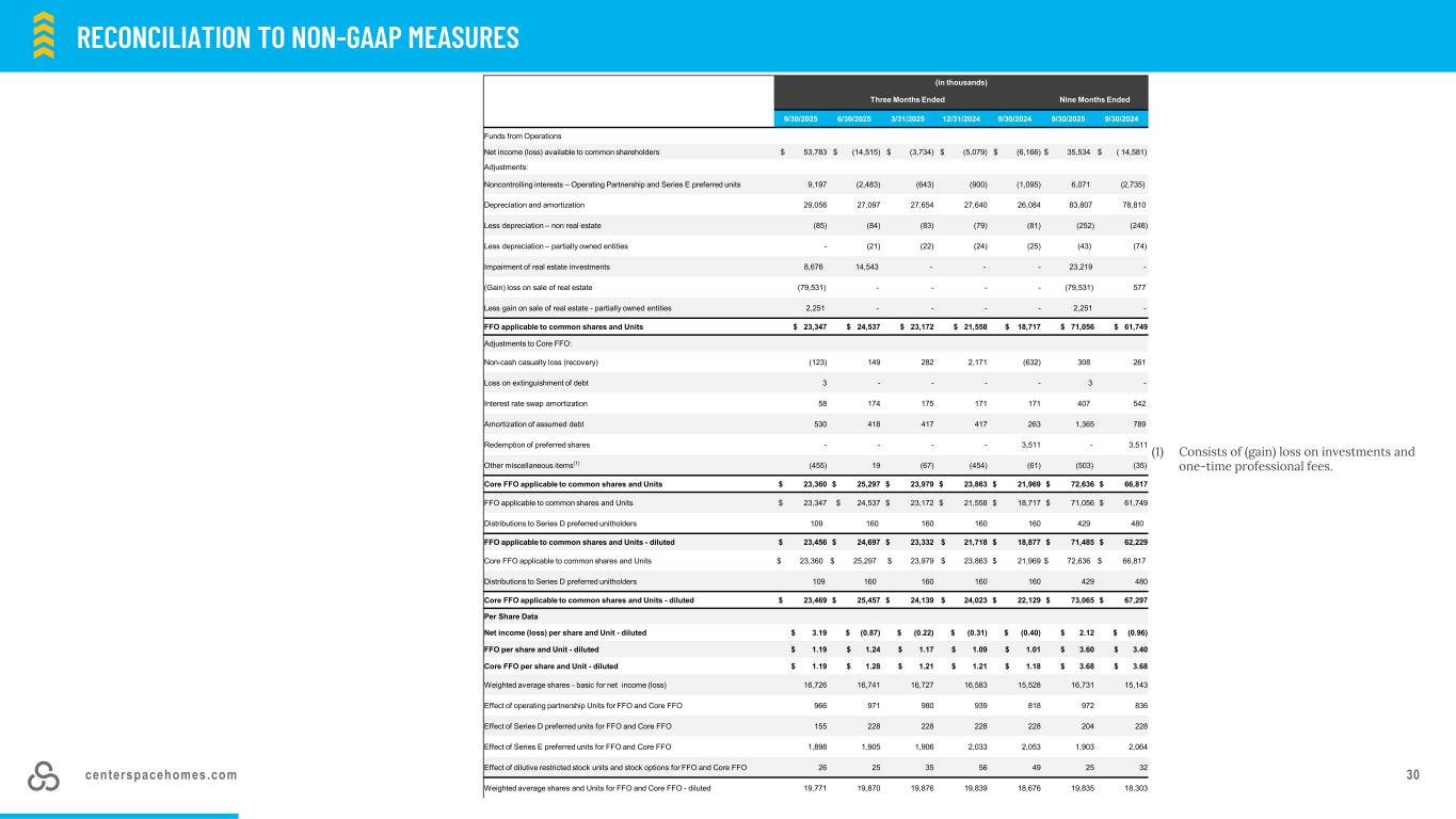 centerspacehomes.com 30 RECONCILIATION TO NON-GAAP MEASURES UpdatedRECONCILIATION TO NON-GAAP MEASURESRECONCILIATION TO NON-GAAP MEASURES (1) Consists of (gain) loss on investments and one-time professional fees. (in thousands) Three Months Ended Nine Months Ended 9/30/2025 6/30/2025 3/31/2025 12/31/2024 9/30/2024 9/30/2025 9/30/2024 Funds from Operations Net income (loss) available to common shareholders $ 53,783 $ (14,515) $ (3,734) $ (5,079) $ (6,166) $ 35,534 $ ( 14,581) Adjustments: Noncontrolling interests – Operating Partnership and Series E preferred units 9,197 (2,483) (643) (900) (1,095) 6,071 (2,735) Depreciation and amortization 29,056 27,097 27,654 27,640 26,084 83,807 78,810 Less depreciation – non real estate (85) (84) (83) (79) (81) (252) (248) Less depreciation – partially owned entities - (21) (22) (24) (25) (43) (74) Impairment of real estate investments 8,676 14,543 - - - 23,219 - (Gain) loss on sale of real estate (79,531) - - - - (79,531) 577 Less gain on sale of real estate - partially owned entities 2,251 - - - - 2,251 - FFO applicable to common shares and Units $ 23,347 $ 24,537 $ 23,172 $ 21,558 $ 18,717 $ 71,056 $ 61,749 Adjustments to Core FFO: Non-cash casualty loss (recovery) (123) 149 282 2,171 (632) 308 261 Loss on extinguishment of debt 3 - - - - 3 - Interest rate swap amortization 58 174 175 171 171 407 542 Amortization of assumed debt 530 418 417 417 263 1,365 789 Redemption of preferred shares - - - - 3,511 - 3,511 Other miscellaneous items(1) (455) 19 (67) (454) (61) (503) (35) Core FFO applicable to common shares and Units $ 23,360 $ 25,297 $ 23,979 $ 23,863 $ 21,969 $ 72,636 $ 66,817 FFO applicable to common shares and Units $ 23,347 $ 24,537 $ 23,172 $ 21,558 $ 18,717 $ 71,056 $ 61,749 Distributions to Series D preferred unitholders 109 160 160 160 160 429 480 FFO applicable to common shares and Units - diluted $ 23,456 $ 24,697 $ 23,332 $ 21,718 $ 18,877 $ 71,485 $ 62,229 Core FFO applicable to common shares and Units $ 23,360 $ 25,297 $ 23,979 $ 23,863 $ 21,969 $ 72,636 $ 66,817 Distributions to Series D preferred unitholders 109 160 160 160 160 429 480 Core FFO applicable to common shares and Units - diluted $ 23,469 $ 25,457 $ 24,139 $ 24,023 $ 22,129 $ 73,065 $ 67,297 Per Share Data Net income (loss) per share and Unit - diluted $ 3.19 $ (0.87) $ (0.22) $ (0.31) $ (0.40) $ 2.12 $ (0.96) FFO per share and Unit - diluted $ 1.19 $ 1.24 $ 1.17 $ 1.09 $ 1.01 $ 3.60 $ 3.40 Core FFO per share and Unit - diluted $ 1.19 $ 1.28 $ 1.21 $ 1.21 $ 1.18 $ 3.68 $ 3.68 Weighted average shares - basic for net income (loss) 16,726 16,741 16,727 16,583 15,528 16,731 15,143 Effect of operating partnership Units for FFO and Core FFO 966 971 980 939 818 972 836 Effect of Series D preferred units for FFO and Core FFO 155 228 228 228 228 204 228 Effect of Series E preferred units for FFO and Core FFO 1,898 1,905 1,906 2,033 2,053 1,903 2,064 Effect of dilutive restricted stock units and stock options for FFO and Core FFO 26 25 35 56 49 25 32 Weighted average shares and Units for FFO and Core FFO - diluted 19,771 19,870 19,876 19,839 18,676 19,835 18,303
