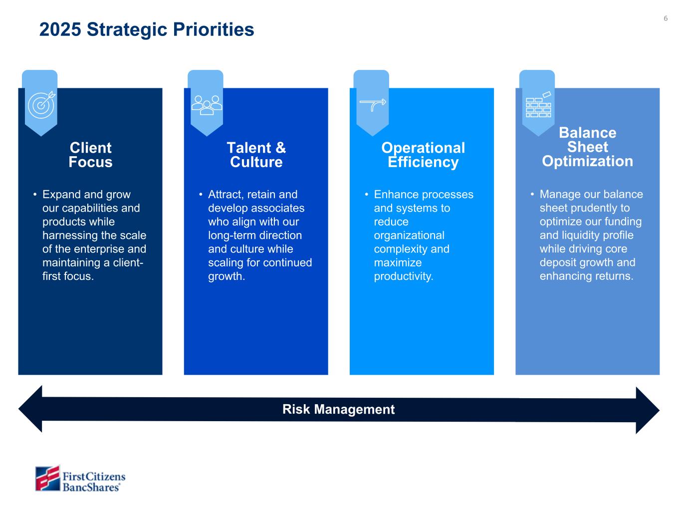 5 First Quarter 2025 Snapshot Key Highlights: ■ Delivered return metrics aligned with our guidance. ■ Loan growth was aligned with our expectations, while deposit growth exceeded them. ■ Terminated the FDIC Shared-Loss Agreement on April 7th as the benefit to capital did not warrant the operational costs associated with maintaining it. ■ Maintained strong capital and liquidity positions with the adjusted CET1 ratio (3) ending the quarter at 12.19%. ■ Repurchased $613 million in Class A common shares, bringing total repurchases since plan inception to $2.4 billion (8.91% of Class A common). ■ Issued $1.25 billion of senior and subordinated notes in March 2025. ■ S&P Global Ratings revised our outlook to stable from negative. Financial Results: Adjusted EPS (1) $37.79 Adjusted ROE / ROA (1) 9.64% / 0.95% NIM 3.26% Adjusted Efficiency Ratio (1) 59.62% Loan / Deposit Growth (2) 0.8% / 2.6% Adjusted CET1 Ratio (3) 12.19% (1) Non-GAAP measure: see Section V entitled Non-GAAP Reconciliations. (2) Loan and deposit growth percentages are quarter over quarter using actual period end balances. (3) The CET1 ratio represents a BancShares ratio and is preliminary pending completion of quarterly regulatory filings. It is adjusted to exclude the impact of the SLA and is a Non-GAAP measure: see Section V entitled Non-GAAP Reconciliations. Data highlighted in yellow to be provided in subsequent draft. Please do not review