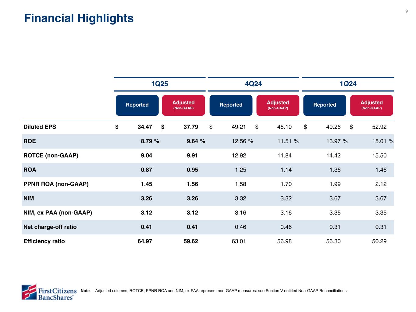 8 1Q25 Financial Results - Takeaways While NII and NIM declined during the quarter, they were aligned with our expectations. The pace of declines in NII and NIM moderated from the fourth quarter. 1 Continued to return capital to shareholders through the repurchase of $613 million in Class A common shares while maintaining a strong CET1 ratio. 6 Credit quality remained stable, with the NCO ratio declining 5 basis points from the linked quarter and finishing on the lower end of our guidance range. 5 Continued to invest in talent, technology and risk infrastructure while realizing the lower end of our noninterest expense guidance. 2 Loans grew $1.1 billion or by 0.8% over the linked quarter. Growth was driven by solid performance in the Commercial Bank and SVB Commercial segments. 3 Deposits grew by $4.1 billion or by 2.6% over the linked quarter exceeding our guidance, driven primarily by growth in the Direct Bank and General Bank segment. 4 While NII declined during the quarter as anticipated, it was aligned with our expectations. 1 Continued to maintain strong CET1 ratio while repurchasing $613 million in Class A common shares during 1Q25, bringing total repurchases since plan inception to $2.4 billion. 7 Credit quality remained stable, with no emerging problems outside of pressure points previously disclosed in the investor dependent, general office, and equipment finance portfolios. 6 Delivered solid noninterest income performance driven primarily by our Rail and commercial banking segments. 2 Continued to invest in talent, technology and risk infrastructure while realizing the lower end of our noninterest expense guidance. 3 Deposits grew by $4.1 billion or by 2.6% over the linked quarter exceeding our guidance, driven by growth in all of our operating segments. 5 Achieved broad-based loan growth in all of our operating segments, with balances up $1.1 billion or by 0.8% over the linked quarter. 4