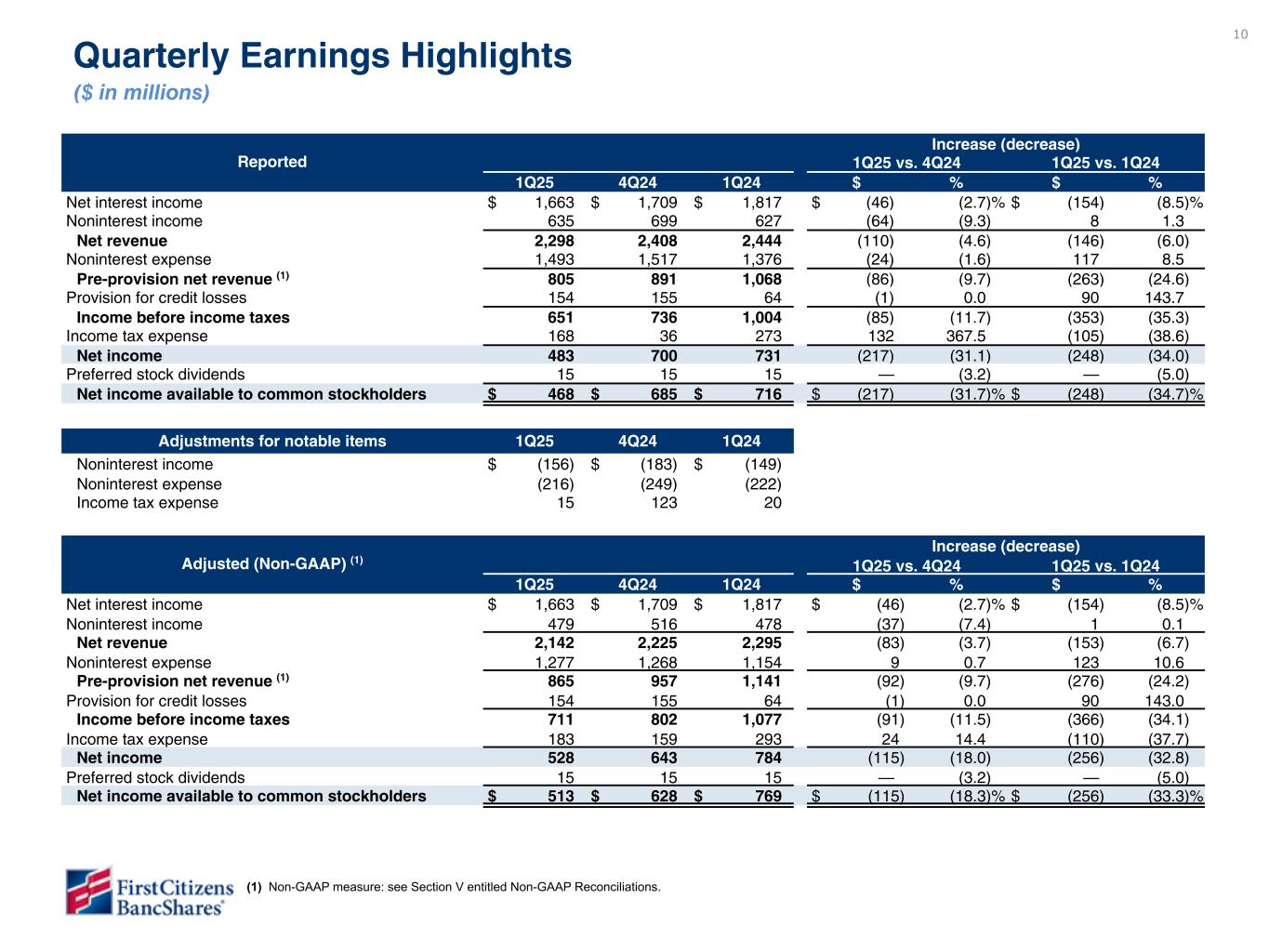 9 1Q25 4Q24 1Q24 Diluted EPS $ 34.47 $ 37.79 $ 49.21 $ 45.10 $ 49.26 $ 52.92 ROE 8.79 % 9.64 % 12.56 % 11.51 % 13.97 % 15.01 % ROTCE (non-GAAP) 9.04 9.91 12.92 11.84 14.42 15.50 ROA 0.87 0.95 1.25 1.14 1.36 1.46 PPNR ROA (non-GAAP) 1.45 1.56 1.58 1.70 1.99 2.12 NIM 3.26 3.26 3.32 3.32 3.67 3.67 NIM, ex PAA (non-GAAP) 3.12 3.12 3.16 3.16 3.35 3.35 Net charge-off ratio 0.41 0.41 0.46 0.46 0.31 0.31 Efficiency ratio 64.97 59.62 63.01 56.98 56.30 50.29 Reported Adjusted (Non-GAAP) Reported Adjusted (Non-GAAP) Reported Adjusted (Non-GAAP) Financial Highlights Quarter-to-date Year-to-date Mar 23 Dec 22 Mar 22 Mar 23 Dec 21 EPS $ 16.67 $ 20.94 $ 19.25 $ 20.77 $ 12.09 $ 12.82 $ 67.40 $ 77.24 $ 53.88 $ 51.88 ROE 11.05 % 13.89 % 12.49 % 13.47 % 10.96 % 11.63 % 11.15 % 12.78 % 12.84 % 12.36 % ROTCE 11.70 % 14.71 % 13.17 % 14.20 % 12.00 % 12.72 % 11.78 % 13.50 % 14.12 % 13.60 % ROA 0.93 % 1.15 % 1.16 % 1.24 % 1.20 % 1.09 % 1.01 % 1.15 % 1.33 % 1.10 % PPNR ROA 1.70 % 1.81 % 1.72 % 1.86 % 1.33 % 1.17 % 1.84 % 1.64 % 1.41 % 1.11 % NIM 3.36 % 3.36 % 3.40 % 3.40 % 2.56 % 2.56 % 3.14 % 3.14 % 2.55 % 2.55 % Net charge-off ratio 0.14 % 0.14 % 0.10 % 0.10 % 0.04 % 0.04 % 0.12 % 0.12 % 0.08 % 0.08 % Efficiency ratio 61.74 % 54.08 % 61.91 % 53.32 % 65.40 % 62.51 % 60.50 % 56.40 % 64.43 % 64.34 % Reported Adjusted (Non-GAAP) Reported Adjusted (Non-GAAP) Reported Adjusted (Non-GAAP) Reported Adjusted (Non-GAAP) Reported Adjusted (Non-GAAP) Note – Adjusted columns, ROTCE, PPNR ROA and NIM, ex PAA represent non-GAAP measures: see Section V entitled Non-GAAP Reconciliations.