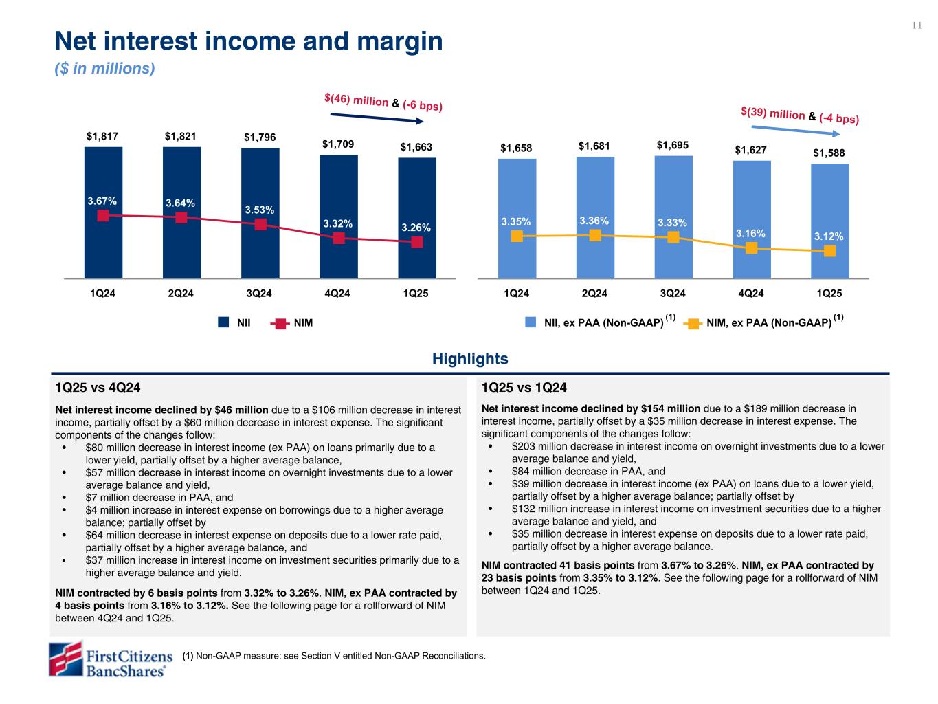 10 Reported Increase (decrease) 1Q25 vs. 4Q24 1Q25 vs. 1Q24 1Q25 4Q24 1Q24 $ % $ % Net interest income $ 1,663 $ 1,709 $ 1,817 $ (46) (2.7) % $ (154) (8.5) % Noninterest income 635 699 627 (64) (9.3) 8 1.3 Net revenue 2,298 2,408 2,444 (110) (4.6) (146) (6.0) Noninterest expense 1,493 1,517 1,376 (24) (1.6) 117 8.5 Pre-provision net revenue (1) 805 891 1,068 (86) (9.7) (263) (24.6) Provision for credit losses 154 155 64 (1) 0.0 90 143.7 Income before income taxes 651 736 1,004 (85) (11.7) (353) (35.3) Income tax expense 168 36 273 132 367.5 (105) (38.6) Net income 483 700 731 (217) (31.1) (248) (34.0) Preferred stock dividends 15 15 15 — (3.2) — (5.0) Net income available to common stockholders $ 468 $ 685 $ 716 $ (217) (31.7) % $ (248) (34.7) % Adjustments for notable items 1Q25 4Q24 1Q24 Noninterest income $ (156) $ (183) $ (149) Noninterest expense (216) (249) (222) Income tax expense 15 123 20 Adjusted (Non-GAAP) (1) Increase (decrease) 1Q25 vs. 4Q24 1Q25 vs. 1Q24 1Q25 4Q24 1Q24 $ % $ % Net interest income $ 1,663 $ 1,709 $ 1,817 $ (46) (2.7) % $ (154) (8.5) % Noninterest income 479 516 478 (37) (7.4) 1 0.1 Net revenue 2,142 2,225 2,295 (83) (3.7) (153) (6.7) Noninterest expense 1,277 1,268 1,154 9 0.7 123 10.6 Pre-provision net revenue (1) 865 957 1,141 (92) (9.7) (276) (24.2) Provision for credit losses 154 155 64 (1) 0.0 90 143.0 Income before income taxes 711 802 1,077 (91) (11.5) (366) (34.1) Income tax expense 183 159 293 24 14.4 (110) (37.7) Net income 528 643 784 (115) (18.0) (256) (32.8) Preferred stock dividends 15 15 15 — (3.2) — (5.0) Net income available to common stockholders $ 513 $ 628 $ 769 $ (115) (18.3) % $ (256) (33.3) % Quarterly Earnings Highlights ($ in millions) (1) Non-GAAP measure: see Section V entitled Non-GAAP Reconciliations.