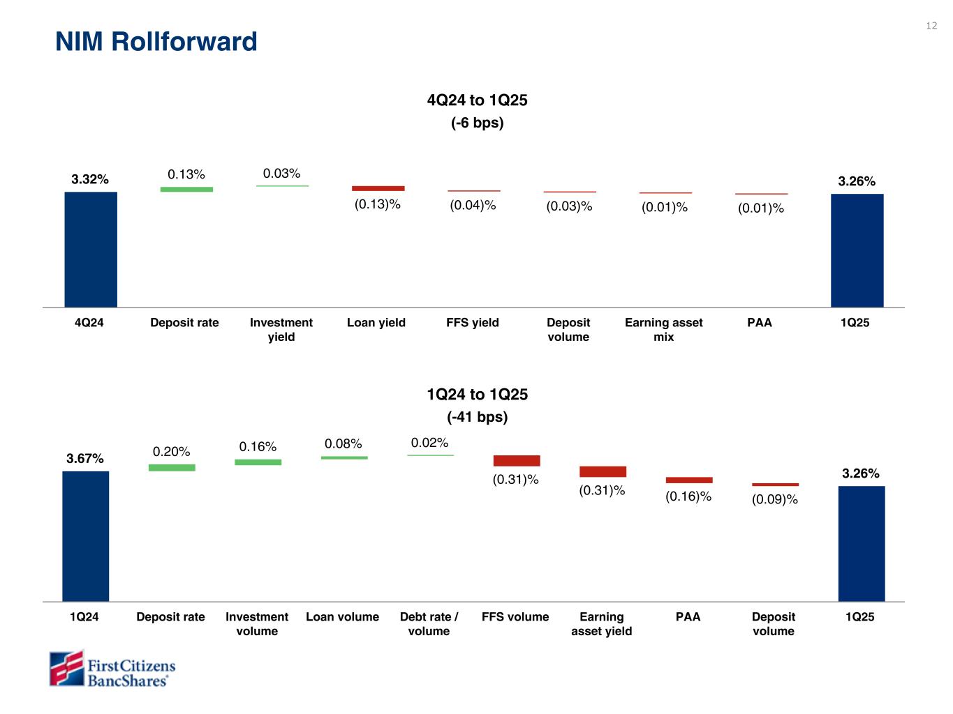11 $1,658 $1,681 $1,695 $1,627 $1,588 3.35% 3.36% 3.33% 3.16% 3.12% NII, ex PAA (Non-GAAP) NIM, ex PAA (Non-GAAP) 1Q24 2Q24 3Q24 4Q24 1Q25 $1,817 $1,821 $1,796 $1,709 $1,663 3.67% 3.64% 3.53% 3.32% 3.26% NII NIM 1Q24 2Q24 3Q24 4Q24 1Q25 $2,441 $2,946 2.55% 3.14% YTD Dec 21 YTD Dec 22 YTD December 2022 vs YTD December 2021 Net interest income increased by $505 million due to a $483 million increase in interest income and a $22 million decrease in interest expense. The change in net interest income was primarily due to the following: ◦ $256 million increase on interest income on loans due to a higher yield and growth offset by lower SBA- PPP interest and fee income and lower accretion income, ◦ $138 million increase in interest income on investment securities due to higher yield and average balance, ◦ $118 million decline in interest expense on borrowings due to a lower rate and average balance, ◦ $89 million increase in interest income on overnight investments due to a higher yield despite a lower average balance; partially offset by a ◦ $96 million increase in interest expense on deposits due to a higher rate paid. NIM expanded from 2.55% to 3.14%. $505 million & 59 bps Highlights $(46) million & (-6 bps) Net interest income and margin ($ in millions) $(39) million & (-4 bps) 1Q25 vs 4Q24 Net interest income declined by $46 million due to a $106 million decrease in interest income, partially offset by a $60 million decrease in interest expense. The significant components of the changes follow: • $80 million decrease in interest income (ex PAA) on loans primarily due to a lower yield, partially offset by a higher average balance, • $57 million decrease in interest income on overnight investments due to a lower average balance and yield, • $7 million decrease in PAA, and • $4 million increase in interest expense on borrowings due to a higher average balance; partially offset by • $64 million decrease in interest expense on deposits due to a lower rate paid, partially offset by a higher average balance, and • $37 million increase in interest income on investment securities primarily due to a higher average balance and yield. NIM contracted by 6 basis points from 3.32% to 3.26%. NIM, ex PAA contracted by 4 basis points from 3.16% to 3.12%. See the following page for a rollforward of NIM between 4Q24 and 1Q25. 1Q25 vs 1Q24 Net interest income declined by $154 million due to a $189 million decrease in interest income, partially offset by a $35 million decrease in interest expense. The significant components of the changes follow: • $203 million decrease in interest income on overnight investments due to a lower average balance and yield, • $84 million decrease in PAA, and • $39 million decrease in interest income (ex PAA) on loans due to a lower yield, partially offset by a higher average balance; partially offset by • $132 million increase in interest income on investment securities due to a higher average balance and yield, and • $35 million decrease in interest expense on deposits due to a lower rate paid, partially offset by a higher average balance. NIM contracted 41 basis points from 3.67% to 3.26%. NIM, ex PAA contracted by 23 basis points from 3.35% to 3.12%. See the following page for a rollforward of NIM between 1Q24 and 1Q25. (1) Non-GAAP measure: see Section V entitled Non-GAAP Reconciliations. (1) (1)