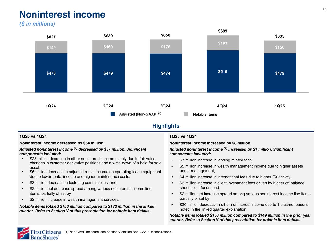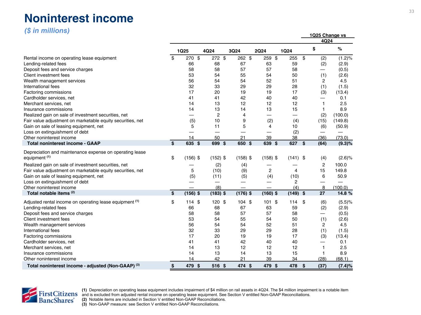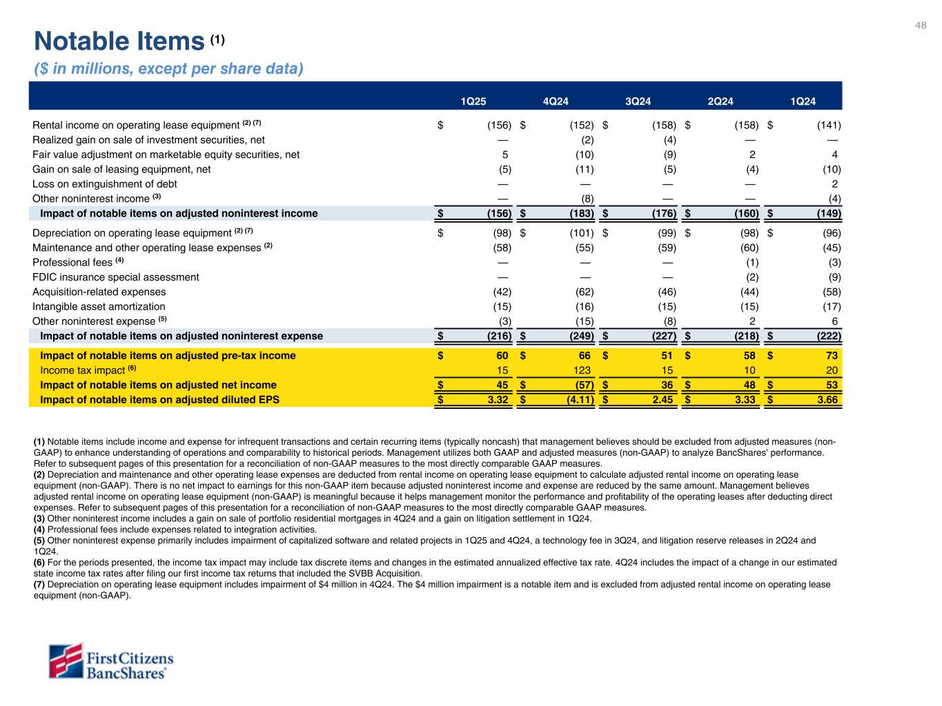 48 1Q23 4Q22 1Q22 Rental income on operating lease equipment (2) $ (156) $ (152) $ (141) Realized gain on sale of investment securities available for sale, net — (2) — Fair value adjustment on marketable equity securities, net 5 (10) 4 Gain on sale of leasing equipment, net (5) (11) (10) Gain on acquisition — — — Gain on extinguishment of debt — — 2 Other noninterest income(3) — (8) (4) Impact on adjusted noninterest income $ (156) $ (183) $ (149) Depreciation on operating lease equipment (2) $ (98) $ (101) $ (96) Maintenance and other operating lease expenses (2) (58) (55) (45) Salaries and benefits — — — Acquisition-related expenses (42) (62) (58) Intangible asset amortization (15) (16) (17) Other noninterest expense (4) (3) (15) 6 Impact on adjusted noninterest expense $ (216) $ (249) $ (222) CECL Day 2 provision and reserve for unfunded commitments — (716) — Provision for credit losses- investment securities available for sale — (4) — Provision for credit losses - total adjustments $ — $ — $ — Impact on adjusted pre-tax income $ 134 $ 173 $ 38 Income tax impact (5) (6) 15 123 20 Impact on adjusted net income $ 45 $ (57) $ 53 Impact on adjusted diluted EPS $ 3.32 $ (4.11) 3.66 Notable Items (1) ($ in millions, except per share data) 1Q25 4Q24 3Q24 2Q24 1Q24 Rental income on operating lease equipment (2) (7) $ (156) $ (152) $ (158) $ (158) $ (141) Realized gain on sale of investment securities, net — (2) (4) — — Fair value adjustment on marketable equity securities, net 5 (10) (9) 2 4 Gain on sale of leasing equipment, net (5) (11) (5) (4) (10) Loss on extinguishment of debt — — — — 2 Other noninterest income (3) — (8) — — (4) Impact of notable items on adjusted noninterest income $ (156) $ (183) $ (176) $ (160) $ (149) Depreciation on operating lease equipment (2) (7) $ (98) $ (101) $ (99) $ (98) $ (96) Maintenance and other operating lease expenses (2) (58) (55) (59) (60) (45) Professional fees (4) — — — (1) (3) FDIC insurance special assessment — — — (2) (9) Acquisition-related expenses (42) (62) (46) (44) (58) Intangible asset amortization (15) (16) (15) (15) (17) Other noninterest expense (5) (3) (15) (8) 2 6 Impact of notable items on adjusted noninterest expense $ (216) $ (249) $ (227) $ (218) $ (222) Impact of notable items on adjusted pre-tax income $ 60 $ 66 $ 51 $ 58 $ 73 Income tax impact (6) 15 123 15 10 20 Impact of notable items on adjusted net income $ 45 $ (57) $ 36 $ 48 $ 53 Impact of notable items on adjusted diluted EPS $ 3.32 $ (4.11) $ 2.45 $ 3.33 $ 3.66 (1) Notable items include income and expense for infrequent transactions and certain recurring items (typically noncash) that management believes should be excluded from adjusted measures (non- GAAP) to enhance understanding of operations and comparability to historical periods. Management utilizes both GAAP and adjusted measures (non-GAAP) to analyze BancShares’ performance. Refer to subsequent pages of this presentation for a reconciliation of non-GAAP measures to the most directly comparable GAAP measures. (2) Depreciation and maintenance and other operating lease expenses are deducted from rental income on operating lease equipment to calculate adjusted rental income on operating lease equipment (non-GAAP). There is no net impact to earnings for this non-GAAP item because adjusted noninterest income and expense are reduced by the same amount. Management believes adjusted rental income on operating lease equipment (non-GAAP) is meaningful because it helps management monitor the performance and profitability of the operating leases after deducting direct expenses. Refer to subsequent pages of this presentation for a reconciliation of non-GAAP measures to the most directly comparable GAAP measures. (3) Other noninterest income includes a gain on sale of portfolio residential mortgages in 4Q24 and a gain on litigation settlement in 1Q24. (4) Professional fees include expenses related to integration activities. (5) Other noninterest expense primarily includes impairment of capitalized software and related projects in 1Q25 and 4Q24, a technology fee in 3Q24, and litigation reserve releases in 2Q24 and 1Q24. (6) For the periods presented, the income tax impact may include tax discrete items and changes in the estimated annualized effective tax rate. 4Q24 includes the impact of a change in our estimated state income tax rates after filing our first income tax returns that included the SVBB Acquisition. (7) Depreciation on operating lease equipment includes impairment of $4 million in 4Q24. The $4 million impairment is a notable item and is excluded from adjusted rental income on operating lease equipment (non-GAAP).