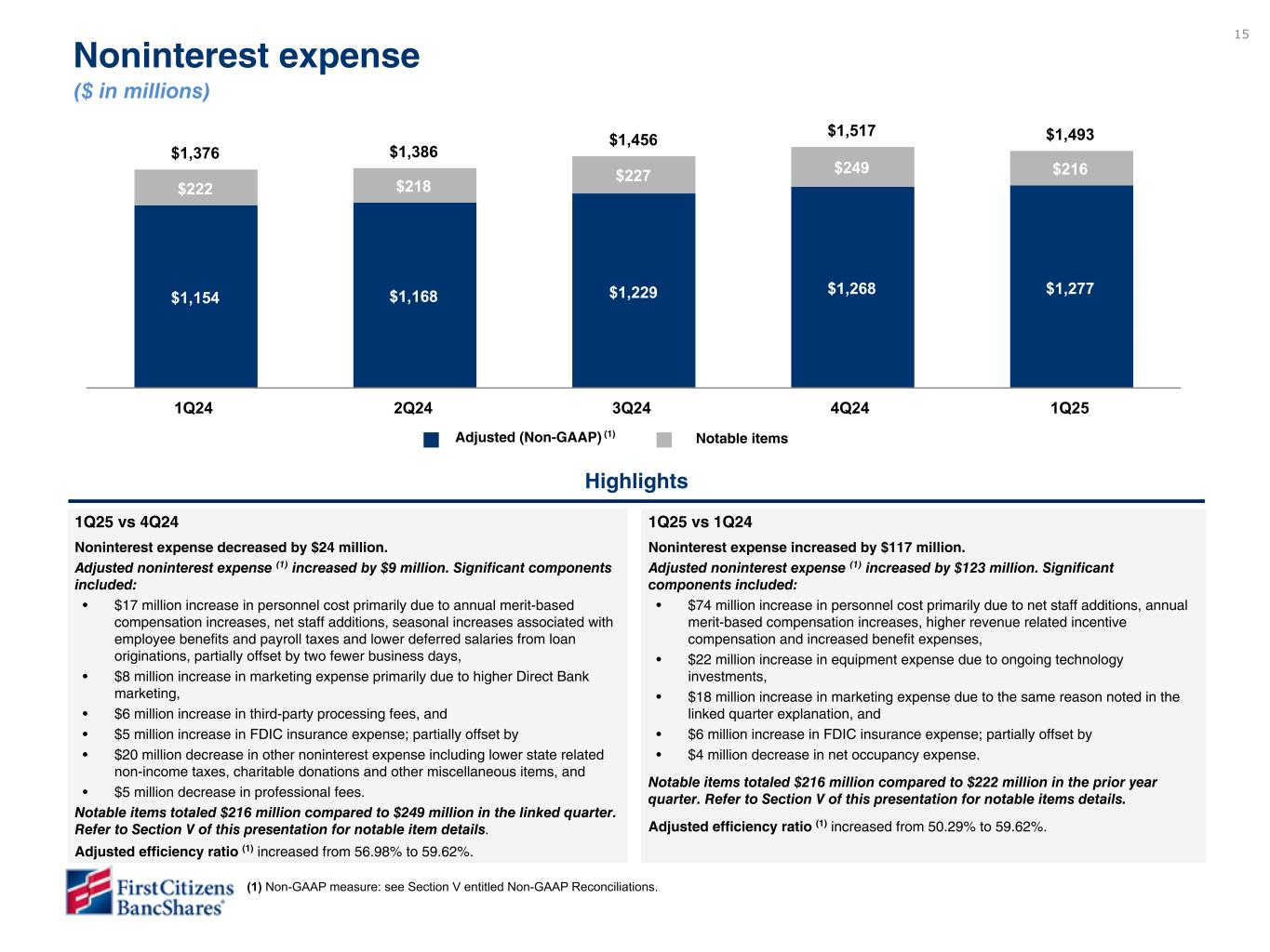 14 $627 $639 $650 $699 $635 $478 $479 $474 $516 $479 $149 $160 $176 $183 $156 1Q24 2Q24 3Q24 4Q24 1Q25 $295 $156 1Q23 SVB contribution $1,940 $2,136 $996 $1,141 $944 $995 YTD Dec 21 YTD Dec 22 1Q25 vs 4Q24 Noninterest income decreased by $64 million. Adjusted noninterest income (1) decreased by $37 million. Significant components included: • $28 million decrease in other noninterest income mainly due to fair value changes in customer derivative positions and a write-down of a held for sale asset, • $6 million decrease in adjusted rental income on operating lease equipment due to lower rental income and higher maintenance costs, • $3 million decrease in factoring commissions, and • $2 million net decrease spread among various noninterest income line items; partially offset by • $2 million increase in wealth management services. Notable items totaled $156 million compared to $183 million in the linked quarter. Refer to Section V of this presentation for notable item details. YTD22 vs YTD21 Noninterest income increased $196 million. Significant components of the change were: ◦ Rental income on operating leases increased $91 million due to the same reasons as in the linked quarter. Expenses on operating lease equipment declined $16 million resulting in a $107 million increase in adjusted rental income. ◦ Cardholder services income, net increased $15 million due to higher volume and fee income and other service charges increased $14 million, primarily due to higher capital markets and portfolio servicing fees. ◦ Wealth management services increased $13 million due to increased brokerage transactions and higher assets under management. ◦ Other noninterest income increased $63 million spread among various line items, including a $431 million bargain purchase gain, partially offset by a $147 million decline in investment gains and a $188 million decline in gains on asset and loan sales. Highlights Noninterest income ($ in millions) Core: ### increase 1Q25 vs 1Q24 Noninterest income increased by $8 million. Adjusted noninterest income (1) increased by $1 million. Significant components included: • $7 million increase in lending related fees, • $5 million increase in wealth management income due to higher assets under management, • $4 million increase in international fees due to higher FX activity, • $3 million increase in client investment fees driven by higher off balance sheet client funds, and • $2 million net increase spread among various noninterest income line items; partially offset by • $20 million decrease in other noninterest income due to the same reasons noted in the linked quarter explanation. Notable items totaled $156 million compared to $149 million in the prior year quarter. Refer to Section V of this presentation for notable item details. Adjusted (Non-GAAP) (1) Notable items $149 - total notable items $156 - total notable items $479 - total adjusted (Non-GAAP) (1) (1) Non-GAAP measure: see Section V entitled Non-GAAP Reconciliations.