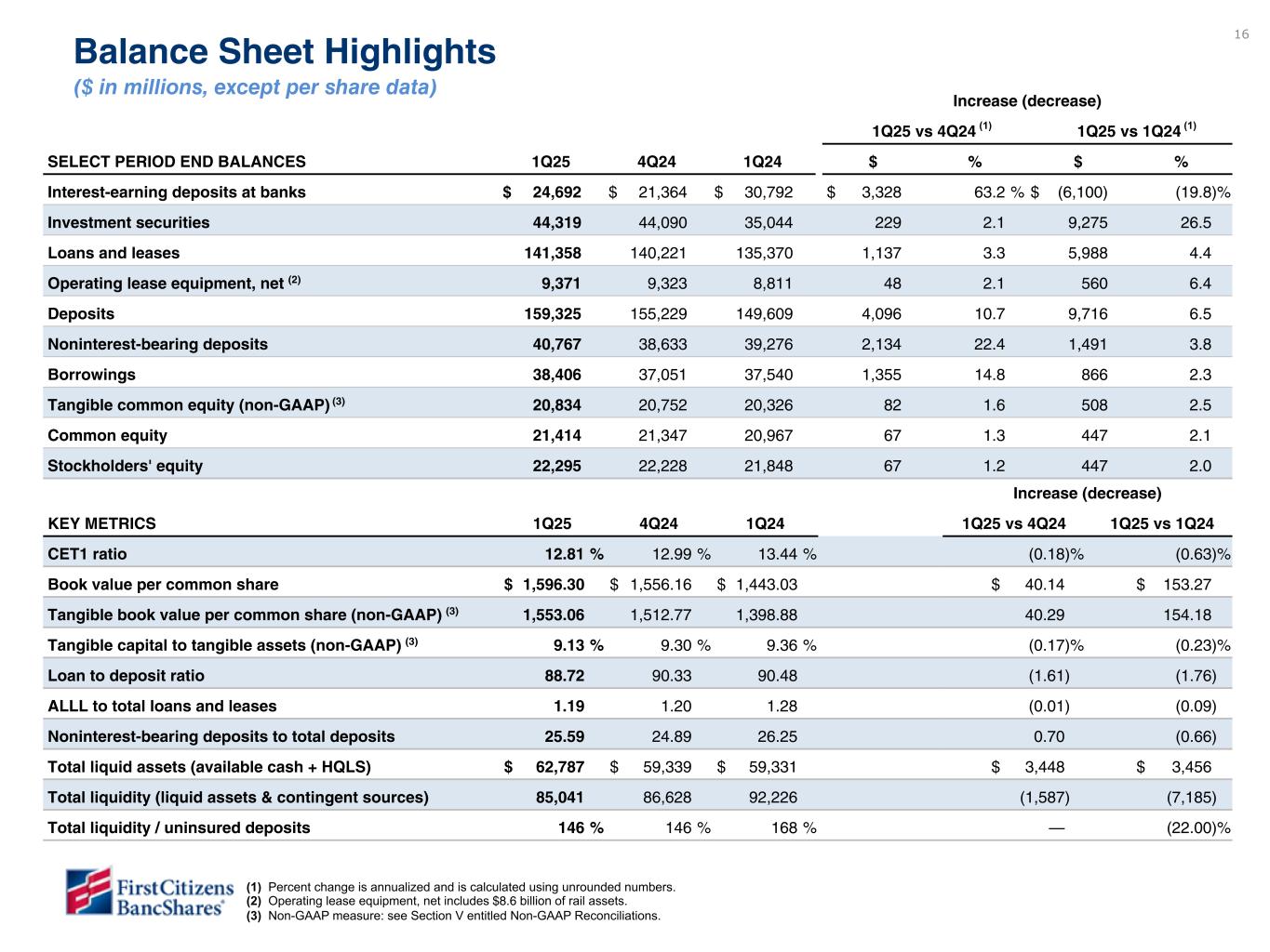 31 Mar 31, 2025 Dec 31, 2024 Sep 30, 2024 Jun 30, 2024 Mar 31, 2024 ASSETS Cash and due from banks $ 812 $ 814 $ 862 $ 764 $ 698 Interest-earning deposits at banks 24,692 21,364 25,640 25,361 30,792 Securities purchased under agreements to resell 345 158 455 392 394 Investment in marketable equity securities 95 101 82 78 79 Investment securities available for sale 33,900 33,750 28,190 27,053 24,915 Investment securities held to maturity 10,324 10,239 10,391 10,535 10,050 Assets held for sale 185 85 68 92 86 Loans and leases 141,358 140,221 138,695 139,341 135,370 Allowance for loan and lease losses (1,680) (1,676) (1,678) (1,700) (1,737) Loans and leases, net of allowance for loan and lease losses 139,678 138,545 137,017 137,641 133,633 Operating lease equipment, net 9,371 9,323 9,186 8,945 8,811 Premises and equipment, net 2,044 2,006 1,974 1,938 1,906 Goodwill 346 346 346 346 346 Other intangible assets, net 234 249 265 280 295 Other assets 6,796 6,740 6,091 6,402 5,831 Total assets $ 228,822 $ 223,720 $ 220,567 $ 219,827 $ 217,836 LIABILITIES Deposits: Noninterest-bearing $ 40,767 $ 38,633 $ 39,396 $ 40,016 $ 39,276 Interest-bearing 118,558 116,596 112,178 111,063 110,333 Total deposits 159,325 155,229 151,574 151,079 149,609 Credit balances of factoring clients 1,145 1,016 1,250 1,175 1,152 Short-term borrowings 450 367 391 386 395 Long-term borrowings 37,956 36,684 36,770 37,072 37,145 Total borrowings 38,406 37,051 37,161 37,458 37,540 Other liabilities 7,651 8,196 7,754 7,628 7,687 Total liabilities 206,527 201,492 197,739 197,340 195,988 STOCKHOLDERS’ EQUITY Preferred stock 881 881 881 881 881 Common stock 13 14 14 15 15 Additional paid in capital 1,798 2,417 3,389 4,099 4,099 Retained earnings 19,802 19,361 18,703 18,102 17,435 Accumulated other comprehensive loss (199) (445) (159) (610) (582) Total stockholders’ equity 22,295 22,228 22,828 22,487 21,848 Total liabilities and stockholders’ equity $ 228,822 $ 223,720 $ 220,567 $ 219,827 $ 217,836 BancShares Balance Sheets (unaudited) ($ in millions)