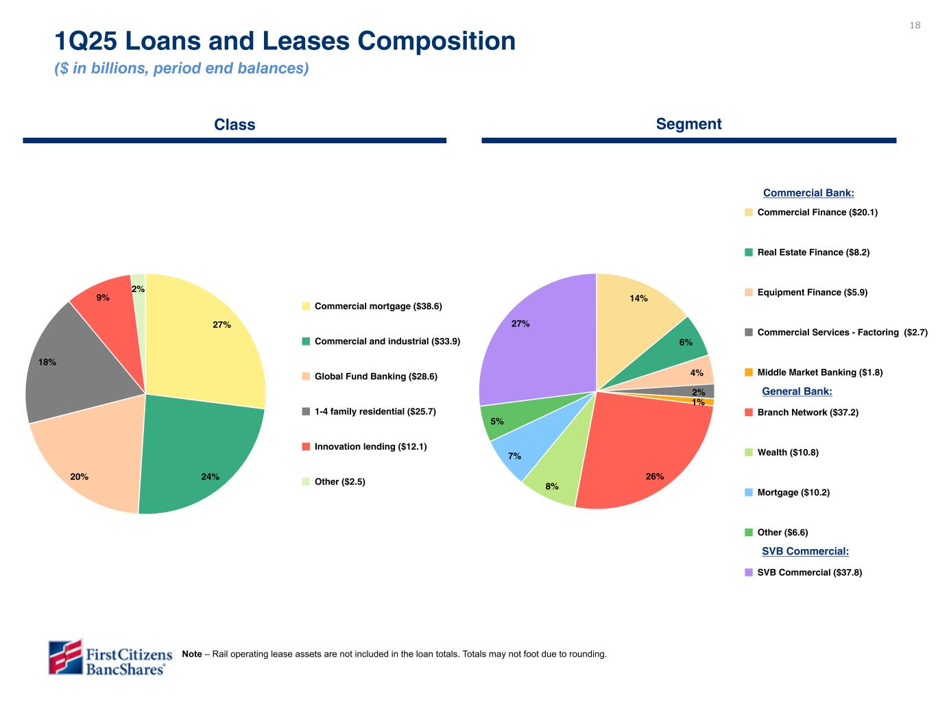 17 $135,370 $139,341 $138,695 $140,221 $141,358 $62,015 $63,327 $64,254 $64,887 $64,847 $36,313 $36,897 $37,343 $37,960 $38,693 $37,042 $39,117 $37,098 $37,374 $37,818 General Bank Commercial Bank SVB Commercial Yield on loans 1Q24 2Q24 3Q24 4Q24 1Q25 Highlights 1Q25 vs 4Q24 • Total loans increased $1.1 billion or by 0.8% sequentially (3.3% annualized). The increase in loans was driven by a $733 million increase in the Commercial Bank and a $444 million increase in SVB Commercial, partially offset by a $40 million decline in the General Bank. • Commercial Bank growth was driven by continued strong performance in our industry verticals, primarily Tech Media and Telecom and Healthcare, as well as higher balances in our Commercial Services (aka factoring) business. SVB Commercial growth was concentrated in Global Fund Banking. • The decrease in the General Bank segment was driven by a decline in commercial loans in the Branch Network, partially offset by loan growth in our Wealth business. 1Q25 vs 1Q24 • Total loans increased $6.0 billion or by 4.4%. The increase in loans was driven by a $2.8 billion (4.6%) increase in the General Bank, a $2.4 billion (6.6%) increase in the Commercial Bank, and a $776 million (2.1%) increase in the SVB Commercial segment. • General Bank loan growth was driven by commercial and business loans in the Branch Network. Commercial Bank loan growth was concentrated in our industry verticals. SVB Commercial loan growth was driven by Global Fund Banking, partially offset by a decline in the Tech and Healthcare business. Loans and Leases ($ in millions, period end balances) 6.69% 7.03%7.15%7.15% 6.49% 10.1% (1) (1) Commercial Bank includes a small amount of Rail loans (less than $100 million in all periods). Rail operating lease assets are not included in the loan totals. Highlighted commentary is being validated with businesses