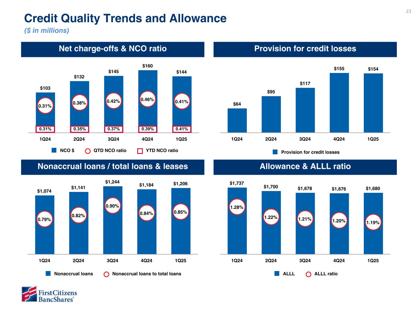 23 $64 $95 $117 $155 $154 Provision for credit losses 1Q24 2Q24 3Q24 4Q24 1Q25 Credit Quality Trends and Allowance ($ in millions) Net charge-offs & NCO ratio Provision for credit losses $103 $132 $145 $160 $144 0.31% 0.38% 0.42% 0.46% 0.41% NCO $ QTD NCO ratio YTD NCO ratio 1Q24 2Q24 3Q24 4Q24 1Q25 $1,074 $1,141 $1,244 $1,184 $1,206 0.79% 0.82% 0.90% 0.84% 0.85% Nonaccrual loans Nonaccrual loans to total loans 1Q24 2Q24 3Q24 4Q24 1Q25 Nonaccrual loans / total loans & leases Allowance & ALLL ratio $1,737 $1,700 $1,678 $1,676 $1,680 1.28% 1.22% 1.21% 1.20% 1.19% ALLL ALLL ratio 1Q24 2Q24 3Q24 4Q24 1Q25 0.41%0.31% 0.35% 0.37% 0.39% To be updated in subsequent draft Nonaccrual loan balance and % to total loans numbers are draft