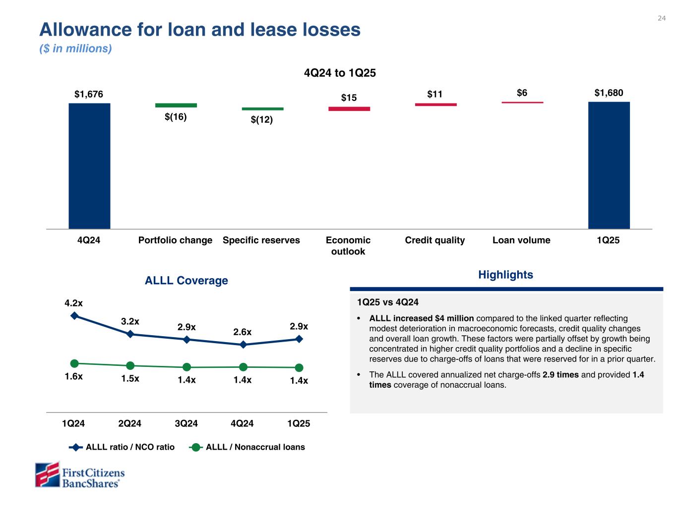 24 $1,676 $(16) $(12) $15 $11 $6 $1,680 4Q24 Portfolio change Specific reserves Economic outlook Credit quality Loan volume 1Q25 Highlights 1Q25 vs 4Q24 • ALLL increased $4 million compared to the linked quarter reflecting modest deterioration in macroeconomic forecasts, credit quality changes and overall loan growth. These factors were partially offset by growth being concentrated in higher credit quality portfolios and a decline in specific reserves due to charge-offs of loans that were reserved for in a prior quarter. • The ALLL covered annualized net charge-offs 2.9 times and provided 1.4 times coverage of nonaccrual loans. ALLL Coverage 4.2x 3.2x 2.9x 2.6x 2.9x 1.6x 1.5x 1.4x 1.4x 1.4x ALLL ratio / NCO ratio ALLL / Nonaccrual loans 1Q24 2Q24 3Q24 4Q24 1Q25 4Q24 to 1Q25 Allowance for loan and lease losses ($ in millions) Please do not review - data still being finalized. To be provided in subsequent draft.