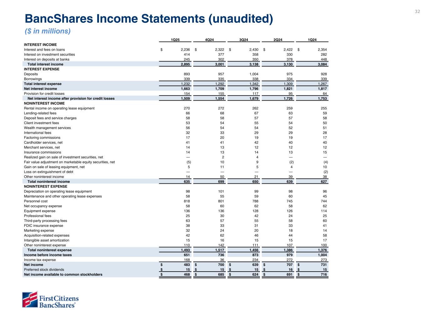 32 1Q25 4Q24 3Q24 2Q24 1Q24 INTEREST INCOME Interest and fees on loans $ 2,236 $ 2,322 $ 2,430 $ 2,422 $ 2,354 Interest on investment securities 414 377 358 330 282 Interest on deposits at banks 245 302 350 378 448 Total interest income 2,895 3,001 3,138 3,130 3,084 INTEREST EXPENSE Deposits 893 957 1,004 975 928 Borrowings 339 335 338 334 339 Total interest expense 1,232 1,292 1,342 1,309 1,267 Net interest income 1,663 1,709 1,796 1,821 1,817 Provision for credit losses 154 155 117 95 64 Net interest income after provision for credit losses 1,509 1,554 1,679 1,726 1,753 NONINTEREST INCOME Rental income on operating lease equipment 270 272 262 259 255 Lending-related fees 66 68 67 63 59 Deposit fees and service charges 58 58 57 57 58 Client investment fees 53 54 55 54 50 Wealth management services 56 54 54 52 51 International fees 32 33 29 29 28 Factoring commissions 17 20 19 19 17 Cardholder services, net 41 41 42 40 40 Merchant services, net 14 13 12 12 12 Insurance commissions 14 13 14 13 15 Realized gain on sale of investment securities, net — 2 4 — — Fair value adjustment on marketable equity securities, net (5) 10 9 (2) (4) Gain on sale of leasing equipment, net 5 11 5 4 10 Loss on extinguishment of debt — — — — (2) Other noninterest income 14 50 21 39 38 Total noninterest income 635 699 650 639 627 NONINTEREST EXPENSE Depreciation on operating lease equipment 98 101 99 98 96 Maintenance and other operating lease expenses 58 55 59 60 45 Personnel cost 818 801 788 745 744 Net occupancy expense 58 60 62 58 62 Equipment expense 136 136 128 126 114 Professional fees 25 30 42 24 25 Third-party processing fees 63 57 55 58 60 FDIC insurance expense 38 33 31 33 41 Marketing expense 32 24 20 18 14 Acquisition-related expenses 42 62 46 44 58 Intangible asset amortization 15 16 15 15 17 Other noninterest expense 110 142 111 107 100 Total noninterest expense 1,493 1,517 1,456 1,386 1,376 Income before income taxes 651 736 873 979 1,004 Income tax expense 168 36 234 272 273 Net income $ 483 $ 700 $ 639 $ 707 $ 731 Preferred stock dividends $ 15 $ 15 $ 15 $ 16 $ 15 Net income available to common stockholders $ 468 $ 685 $ 624 $ 691 $ 716 BancShares Income Statements (unaudited) ($ in millions)