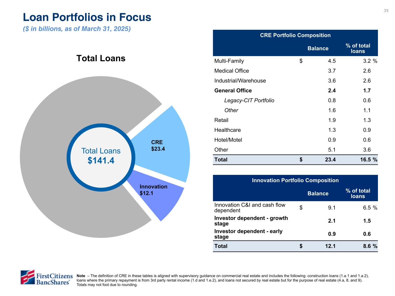 35 Loan Portfolios in Focus ($ in billions, as of March 31, 2025) Total Loans $141.4 Total Loans CRE $23.4 CRE Portfolio Composition Balance % of total loans Multi-Family $ 4.5 3.2 % Medical Office 3.7 2.6 Industrial/Warehouse 3.6 2.6 General Office 2.4 1.7 Legacy-CIT Portfolio 0.8 0.6 Other 1.6 1.1 Retail 1.9 1.3 Healthcare 1.3 0.9 Hotel/Motel 0.9 0.6 Other 5.1 3.6 Total $ 23.4 16.5 % Innovation Portfolio Composition Balance % of total loans Innovation C&I and cash flow dependent $ 9.1 6.5 % Investor dependent - growth stage 2.1 1.5 Investor dependent - early stage 0.9 0.6 Total $ 12.1 8.6 % Innovation $12.1 Note – The definition of CRE in these tables is aligned with supervisory guidance on commercial real estate and includes the following: construction loans (1.a.1 and 1.a.2), loans where the primary repayment is from 3rd party rental income (1.d and 1.e.2), and loans not secured by real estate but for the purpose of real estate (4.a, 8, and 9). Totals may not foot due to rounding. CRE data remains under review as we are still working through internal validations