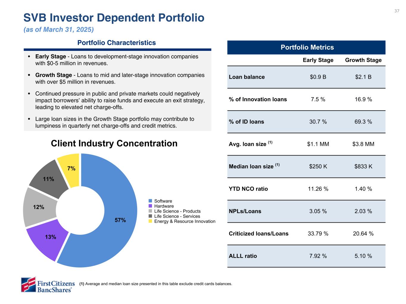 36 General Office CRE Portfolio (as of March 31, 2025) CA 23% NC / SC 21% FL 10% MA 9% TX 4% VA 4% TN 4% Other 25% Total General Office $2.4 B Geographic Diversification Top 5 MSAs ($ in millions) Los Angeles $ 389 Boston $ 218 Charlotte $ 112 Raleigh $ 99 Tampa $ 85 Percent of total loans 0.6 % General Office Portfolio Metrics % of total loans 1.7 % % of CRE loans 10.2 % Average loan amount $1.8 MM YTD NCO ratio 4.77 % Delinquencies/Loans 11.08 % NPLs/Loans 10.87 % Criticized loans/Loans 20.94 % ALLL ratio 4.35 % Portfolio Characteristics • Evolving macroeconomic and social conditions (including the shift to more hybrid work arrangements) have resulted in changing demands for office property and stress within our portfolio. • The portfolio is geographically diversified and helps to reduce concentration risk in any particular city or state. • Stress to date within the portfolio has been limited to the Legacy-CIT portfolio which totaled approximately $0.8 billion with an ALLL ratio of 11.89% as of March 31, 2025. It is comprised primarily of reposition/bridge loans secured by Class B office properties. CRE data remains under review as we are still working through internal validations