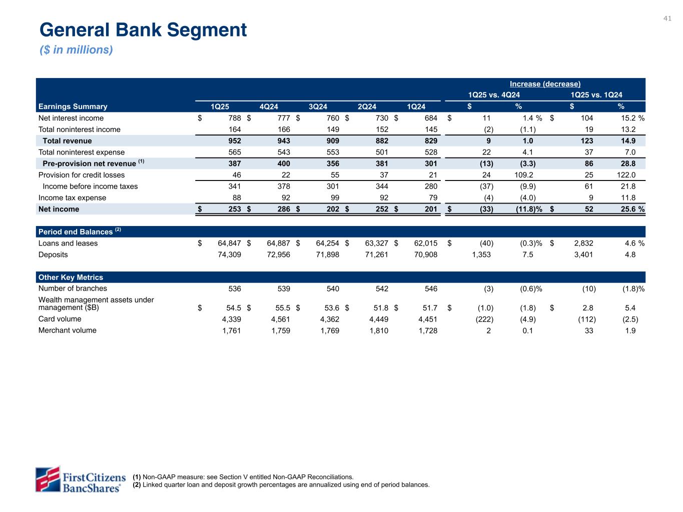 41 General Bank Segment ($ in millions) (1) Non-GAAP measure: see Section V entitled Non-GAAP Reconciliations. (2) Linked quarter loan and deposit growth percentages are annualized using end of period balances. Increase (decrease) 1Q25 vs. 4Q24 1Q25 vs. 1Q24 Earnings Summary 1Q25 4Q24 3Q24 2Q24 1Q24 $ % $ % Net interest income $ 788 $ 777 $ 760 $ 730 $ 684 $ 11 1.4 % $ 104 15.2 % Total noninterest income 164 166 149 152 145 (2) (1.1) 19 13.2 Total revenue 952 943 909 882 829 9 1.0 123 14.9 Total noninterest expense 565 543 553 501 528 22 4.1 37 7.0 Pre-provision net revenue (1) 387 400 356 381 301 (13) (3.3) 86 28.8 Provision for credit losses 46 22 55 37 21 24 109.2 25 122.0 Income before income taxes 341 378 301 344 280 (37) (9.9) 61 21.8 Income tax expense 88 92 99 92 79 (4) (4.0) 9 11.8 Net income $ 253 $ 286 $ 202 $ 252 $ 201 $ (33) (11.8) % $ 52 25.6 % Period end Balances (2) Loans and leases $ 64,847 $ 64,887 $ 64,254 $ 63,327 $ 62,015 $ (40) (0.3) % $ 2,832 4.6 % Deposits 74,309 72,956 71,898 71,261 70,908 1,353 7.5 3,401 4.8 Other Key Metrics Number of branches 536 539 540 542 546 (3) (0.6) % (10) (1.8) % Wealth management assets under management ($B) $ 54.5 $ 55.5 $ 53.6 $ 51.8 $ 51.7 $ (1.0) (1.8) $ 2.8 5.4 Card volume 4,339 4,561 4,362 4,449 4,451 (222) (4.9) (112) (2.5) Merchant volume 1,761 1,759 1,769 1,810 1,728 2 0.1 33 1.9 Highlights • The General Bank segment achieved strong loan growth during the quarter, 4.1% annualized over the linked quarter, driven primarily by business and commercial loan production in the Branch Network. • Deposits increased $893 million compared to the linked quarter driven by growth in the Branch Network. • Segment net revenue increased $32 million compared to the linked quarter as net interest income increased $15 million and noninterest income increased by $17 million. Noninterest expense decreased by $20 million compared to the linked quarter. Please do not review - data is not available. To be provided in subsequent draft. Data has not yet been validated. To be finalized in subsequent draft.
