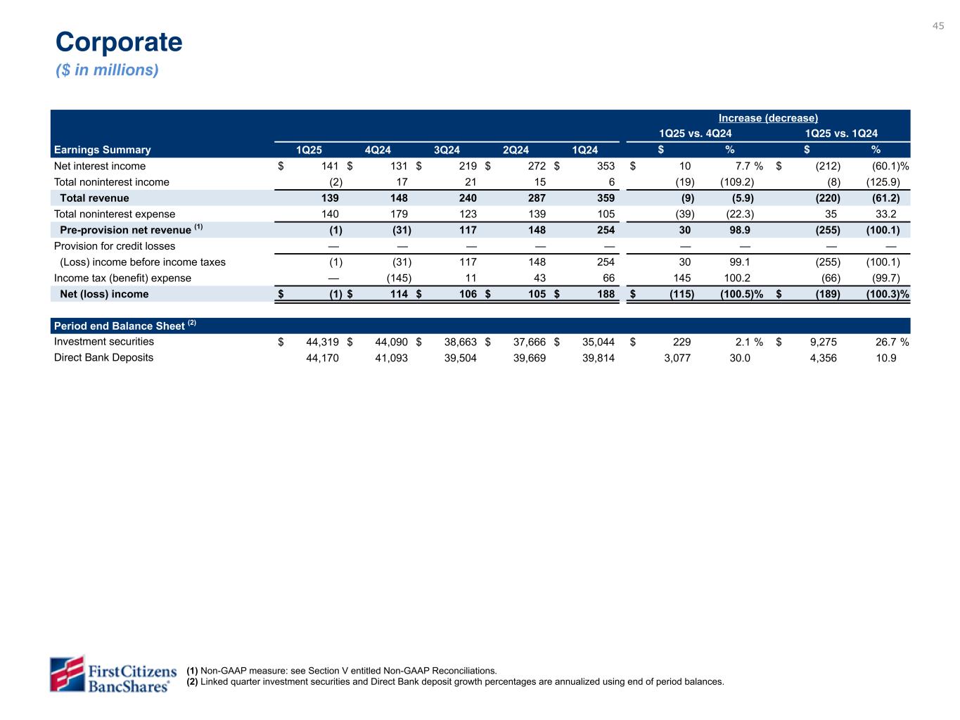 45 Highlights • Net interest income decreased compared to the linked quarter driven primarily by lower interest income from overnight investments and higher interest expense from growth in Direct Bank deposits, partially offset by increased interest income from higher investment securities. • Noninterest expense increased driven primarily by similar items as noted on slide 16. • Direct Bank deposits reflect continued growth in the channel even with declining rates paid. Corporate ($ in millions) (1) Non-GAAP measure: see Section V entitled Non-GAAP Reconciliations. (2) Linked quarter investment securities and Direct Bank deposit growth percentages are annualized using end of period balances. Increase (decrease) 1Q25 vs. 4Q24 1Q25 vs. 1Q24 Earnings Summary 1Q25 4Q24 3Q24 2Q24 1Q24 $ % $ % Net interest income $ 141 $ 131 $ 219 $ 272 $ 353 $ 10 7.7 % $ (212) (60.1) % Total noninterest income (2) 17 21 15 6 (19) (109.2) (8) (125.9) Total revenue 139 148 240 287 359 (9) (5.9) (220) (61.2) Total noninterest expense 140 179 123 139 105 (39) (22.3) 35 33.2 Pre-provision net revenue (1) (1) (31) 117 148 254 30 98.9 (255) (100.1) Provision for credit losses — — — — — — — — — (Loss) income before income taxes (1) (31) 117 148 254 30 99.1 (255) (100.1) Income tax (benefit) expense — (145) 11 43 66 145 100.2 (66) (99.7) Net (loss) income $ (1) $ 114 $ 106 $ 105 $ 188 $ (115) (100.5) % $ (189) (100.3) % Period end Balance Sheet (2) Investment securities $ 44,319 $ 44,090 $ 38,663 $ 37,666 $ 35,044 $ 229 2.1 % $ 9,275 26.7 % Direct Bank Deposits 44,170 41,093 39,504 39,669 39,814 3,077 30.0 4,356 10.9 Please do not review - data is not available. To be provided in subsequent draft. Data has not yet been validated. To be finalized in subsequent draft.