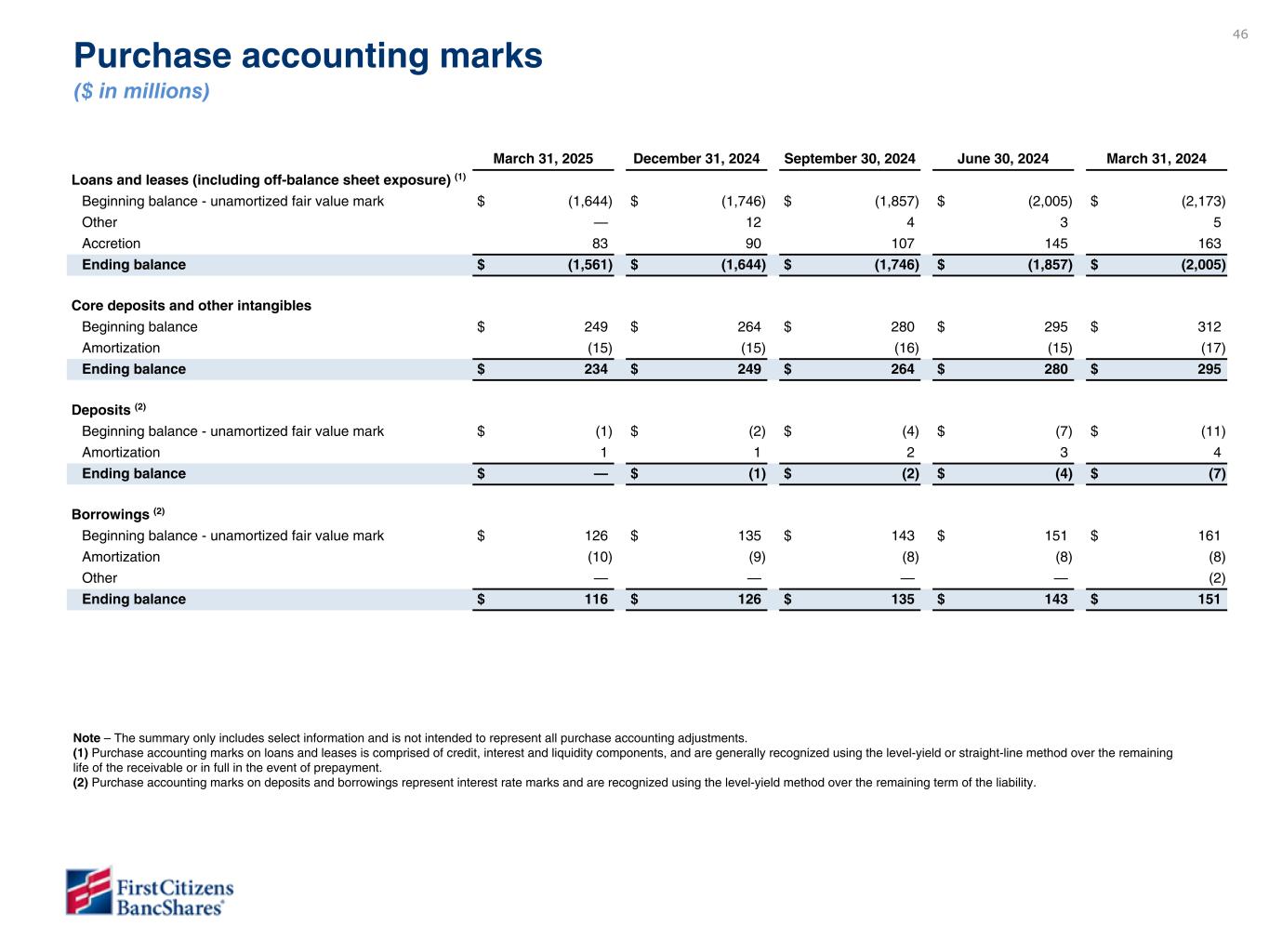 46 March 31, 2025 December 31, 2024 September 30, 2024 June 30, 2024 March 31, 2024 Loans and leases (including off-balance sheet exposure) (1) Beginning balance - unamortized fair value mark $ (1,644) $ (1,746) $ (1,857) $ (2,005) $ (2,173) Other — 12 4 3 5 Accretion 83 90 107 145 163 Ending balance $ (1,561) $ (1,644) $ (1,746) $ (1,857) $ (2,005) Core deposits and other intangibles Beginning balance $ 249 $ 264 $ 280 $ 295 $ 312 Amortization (15) (15) (16) (15) (17) Ending balance $ 234 $ 249 $ 264 $ 280 $ 295 Deposits (2) Beginning balance - unamortized fair value mark $ (1) $ (2) $ (4) $ (7) $ (11) Amortization 1 1 2 3 4 Ending balance $ — $ (1) $ (2) $ (4) $ (7) Borrowings (2) Beginning balance - unamortized fair value mark $ 126 $ 135 $ 143 $ 151 $ 161 Amortization (10) (9) (8) (8) (8) Other — — — — (2) Ending balance $ 116 $ 126 $ 135 $ 143 $ 151 Purchase accounting marks ($ in millions) Note – The summary only includes select information and is not intended to represent all purchase accounting adjustments. (1) Purchase accounting marks on loans and leases is comprised of credit, interest and liquidity components, and are generally recognized using the level-yield or straight-line method over the remaining life of the receivable or in full in the event of prepayment. (2) Purchase accounting marks on deposits and borrowings represent interest rate marks and are recognized using the level-yield method over the remaining term of the liability.
