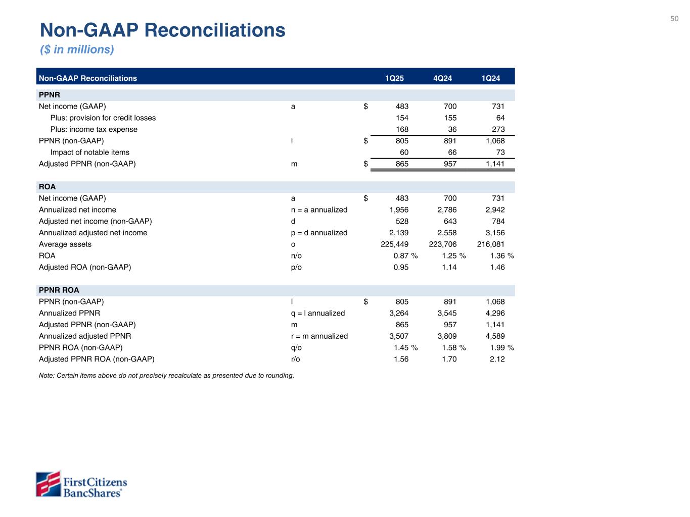 49 Non-GAAP Reconciliations 1Q25 4Q24 3Q24 2Q24 1Q24 Net income and EPS Net income (GAAP) a $ 483 700 639 707 731 Preferred stock dividends 15 15 15 16 15 Net income available to common stockholders (GAAP) b 468 685 624 691 716 Total notable items, after income tax c 45 (57) 36 48 53 Adjusted net income (non-GAAP) d = (a+c) 528 643 675 755 784 Adjusted net income available to common stockholders (non-GAAP) e = (b+c) $ 513 628 660 739 769 Weighted average common shares outstanding Basic f 13,575,231 13,927,887 14,375,974 14,534,499 14,533,302 Diluted g 13,575,231 13,927,887 14,375,974 14,534,499 14,536,442 EPS (GAAP) Basic b/f $ 34.47 49.21 43.42 47.54 49.27 Diluted b/g 34.47 49.21 43.42 47.54 49.26 Adjusted EPS (non-GAAP) Basic e/f $ 37.79 45.10 45.87 50.87 52.94 Diluted e/g 37.79 45.10 45.87 50.87 52.92 Noninterest income and expense Noninterest income (GAAP) h $ 635 699 650 639 627 Impact of notable items, before income tax (156) (183) (176) (160) (149) Adjusted noninterest income (non-GAAP) i $ 479 516 474 479 478 Noninterest expense (GAAP) j $ 1,493 1,517 1,456 1,386 1,376 Impact of notable items, before income tax (216) (249) (227) (218) (222) Adjusted noninterest expense (non-GAAP) k $ 1,277 1,268 1,229 1,168 1,154 Note: Certain items above do not precisely recalculate as presented due to rounding. Non-GAAP Reconciliations ($ in millions, except share and per share data)