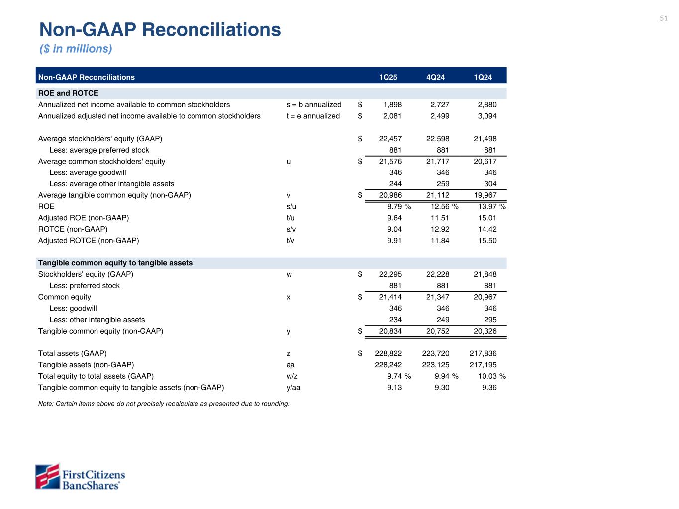 50 Non-GAAP Reconciliations ($ in millions) Non-GAAP Reconciliations 1Q25 4Q24 1Q24 PPNR Net income (GAAP) a $ 483 700 731 Plus: provision for credit losses 154 155 64 Plus: income tax expense 168 36 273 PPNR (non-GAAP) l $ 805 891 1,068 Impact of notable items 60 66 73 Adjusted PPNR (non-GAAP) m $ 865 957 1,141 ROA Net income (GAAP) a $ 483 700 731 Annualized net income n = a annualized 1,956 2,786 2,942 Adjusted net income (non-GAAP) d 528 643 784 Annualized adjusted net income p = d annualized 2,139 2,558 3,156 Average assets o 225,449 223,706 216,081 ROA n/o 0.87 % 1.25 % 1.36 % Adjusted ROA (non-GAAP) p/o 0.95 1.14 1.46 PPNR ROA PPNR (non-GAAP) l $ 805 891 1,068 Annualized PPNR q = l annualized 3,264 3,545 4,296 Adjusted PPNR (non-GAAP) m 865 957 1,141 Annualized adjusted PPNR r = m annualized 3,507 3,809 4,589 PPNR ROA (non-GAAP) q/o 1.45 % 1.58 % 1.99 % Adjusted PPNR ROA (non-GAAP) r/o 1.56 1.70 2.12 Note: Certain items above do not precisely recalculate as presented due to rounding.