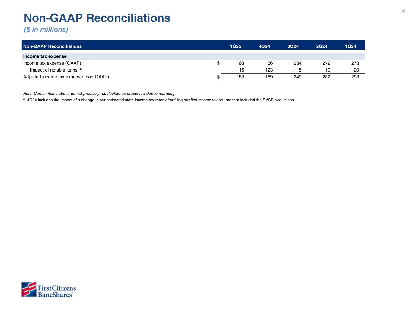 56 Non-GAAP Reconciliations ($ in millions) Non-GAAP Reconciliations 1Q25 4Q24 3Q24 2Q24 1Q24 Income tax expense Income tax expense (GAAP) $ 168 36 234 272 273 Impact of notable items (1) 15 123 15 10 20 Adjusted income tax expense (non-GAAP) $ 183 159 249 282 293 Note: Certain items above do not precisely recalculate as presented due to rounding. (1) 4Q24 includes the impact of a change in our estimated state income tax rates after filing our first income tax returns that included the SVBB Acquisition.