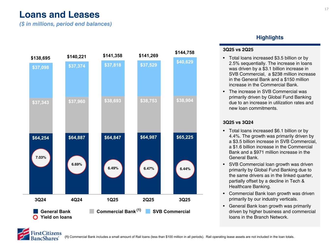 16 16 Increase (decrease) 3Q25 vs 2Q25 3Q25 vs 3Q24 SELECT PERIOD END BALANCES 3Q25 2Q25 3Q24 $ % $ % Interest-earning deposits at banks $ 24,798 $ 26,184 $ 25,640 $ (1,386) (21.6) % $ (842) (3.4) % Investment securities 45,124 43,346 38,663 1,778 16.3 6,461 16.7 Loans and leases 144,758 141,269 138,695 3,489 9.8 6,063 4.4 Operating lease equipment, net (2) 9,446 9,466 9,186 (20) (0.8) 260 2.8 Deposits 163,190 159,935 151,574 3,255 8.1 11,616 7.7 Noninterest-bearing deposits 42,752 40,879 39,396 1,873 18.2 3,356 8.5 Borrowings 38,675 38,112 37,161 563 5.9 1,514 4.1 Tangible common equity (non-GAAP) (3) 20,551 20,848 21,336 (297) (5.6) (785) (3.7) Common equity 21,105 21,415 21,947 (310) (5.7) (842) (3.8) Stockholders' equity 21,986 22,296 22,828 (310) (5.5) (842) (3.7) Increase (decrease) KEY METRICS 3Q25 2Q25 3Q24 3Q25 vs 2Q25 3Q25 vs 3Q24 CET1 ratio (4) 11.65 % 12.12 % 13.24 % (0.47) % (1.59) % Book value per common share $ 1,672.54 $ 1,637.72 $ 1,547.81 $ 34.82 $ 124.73 Tangible book value per common share (non-GAAP) (3) 1,628.64 1,594.38 1,504.75 34.26 123.89 Tangible capital to tangible assets (non-GAAP) (3) 8.82 % 9.10 % 9.70 % (0.28) % (0.88) % Loan to deposit ratio 88.71 88.33 91.50 0.38 (2.79) ALLL to total loans and leases 1.14 1.18 1.21 (0.04) (0.07) Noninterest-bearing deposits to total deposits 26.20 25.56 25.99 0.64 0.21 Total liquid assets (available cash + HQLS) $ 61,924 $ 63,616 $ 58,359 $ (1,692) $ 3,565 Total liquidity (liquid assets & contingent sources) 93,274 92,129 88,001 1,145 5,273 Total liquidity / uninsured deposits 156 % 159 % 150 % (3.00) % 6.00 % Balance Sheet Highlights ($ in millions, except per share data) (1) (1) (1) Percent change is annualized and is calculated using unrounded numbers. (2) Operating lease equipment, net includes $8.7 billion of rail assets as of 3Q25. (3) Non-GAAP measure: see Section V entitled Non-GAAP Reconciliations. (4) The SLA was terminated in early 2Q25 and therefore does not benefit risk-based capital ratios for subsequent period ends. Risk-based capital ratios prior to 2Q25 include the benefit of the SLA. CET1 ratio highlighted in yellow is directional, but not yet final.