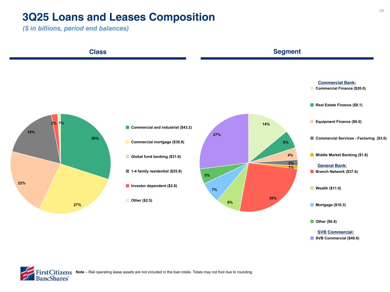 17 3Q25 vs 2Q25 • Total loans increased $3.5 billion or by 2.5% sequentially. The increase in loans was driven by a $3.1 billion increase in SVB Commercial, a $238 million increase in the General Bank and a $150 million increase in the Commercial Bank. • The increase in SVB Commercial was primarily driven by Global Fund Banking due to an increase in utilization rates and new loan commitments. 3Q25 vs 3Q24 • Total loans increased $6.1 billion or by 4.4%. The growth was primarily driven by a $3.5 billion increase in SVB Commercial, a $1.6 billion increase in the Commercial Bank and a $971 million increase in the General Bank. • SVB Commercial loan growth was driven primarily by Global Fund Banking due to the same drivers as in the linked quarter, partially offset by a decline in Tech & Healthcare Banking. • Commercial Bank loan growth was driven primarily by our industry verticals. • General Bank loan growth was primarily driven by higher business and commercial loans in the Branch Network. $138,695 $140,221 $141,358 $141,269 $144,758 $64,254 $64,887 $64,847 $64,987 $65,225 $37,343 $37,960 $38,693 $38,753 $38,904 $37,098 $37,374 $37,818 $37,529 $40,629 General Bank Commercial Bank SVB Commercial Yield on loans 3Q24 4Q24 1Q25 2Q25 3Q25 Highlights Loans and Leases ($ in millions, period end balances) 6.47%6.49% 6.69% 7.03% 6.44% 10.1% (1) (1) Commercial Bank includes a small amount of Rail loans (less than $100 million in all periods). Rail operating lease assets are not included in the loan totals. Loan data is preliminary and subject to change pending final rounding files from SEC team