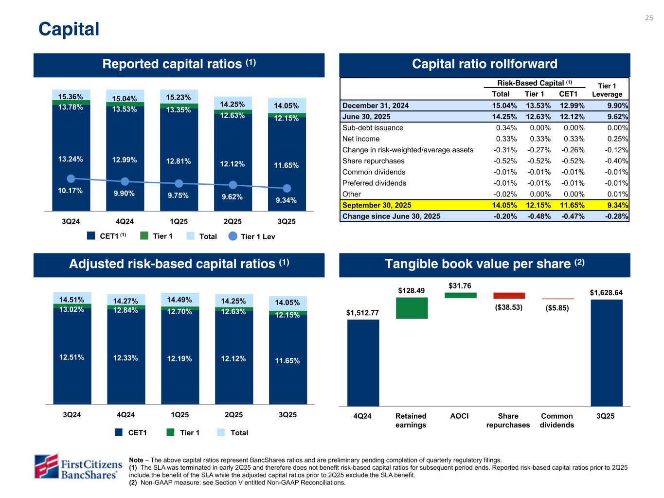 25 Reported capital ratios (1) Capital ratio rollforward Adjusted risk-based capital ratios (1) Tangible book value per share (2) Capital Risk-Based Capital (1) Tier 1 Leverage Total Tier 1 CET1 December 31, 2024 15.04 % 13.53 % 12.99 % 9.90 % June 30, 2025 14.25 % 12.63 % 12.12 % 9.62 % Sub-debt issuance 0.34 % 0.00 % 0.00 % 0.00 % Net income 0.33 % 0.33 % 0.33 % 0.25 % Change in risk-weighted/average assets -0.31 % -0.27 % -0.26 % -0.12 % Share repurchases -0.52 % -0.52 % -0.52 % -0.40 % Common dividends -0.01 % -0.01 % -0.01 % -0.01 % Preferred dividends -0.01 % -0.01 % -0.01 % -0.01 % Other -0.02 % 0.00 % 0.00 % 0.01 % September 30, 2025 14.05 % 12.15 % 11.65 % 9.34 % Change since June 30, 2025 -0.20 % -0.48 % -0.47 % -0.28 % 13.24% 12.99% 12.81% 12.12% 11.65% 13.78% 13.53% 13.35% 12.63% 12.15% 15.36% 15.04% 15.23% 14.25% 14.05% 3Q24 4Q24 1Q25 2Q25 3Q25 $1,512.77 $128.49 $31.76 ($38.53) ($5.85) $1,628.64 4Q24 Retained earnings AOCI Share repurchases Common dividends 3Q25 Note – The above capital ratios represent BancShares ratios and are preliminary pending completion of quarterly regulatory filings. (1) The SLA was terminated in early 2Q25 and therefore does not benefit risk-based capital ratios for subsequent period ends. Reported risk-based capital ratios prior to 2Q25 include the benefit of the SLA while the adjusted capital ratios prior to 2Q25 exclude the SLA benefit. (2) Non-GAAP measure: see Section V entitled Non-GAAP Reconciliations. 10.17% 9.90% 9.75% 9.62% 9.34% Tier 1 Lev 12.51% 12.33% 12.19% 12.12% 11.65% 13.02% 12.84% 12.70% 12.63% 12.15% 14.51% 14.27% 14.49% 14.25% 14.05% CET1 Tier 1 Total 3Q24 4Q24 1Q25 2Q25 3Q25 Please do not review - data still being finalized. To be provided in subsequent draft. CET1 (1) Tier 1 Total To be updated in subsequent draft once data is available. Please do not review