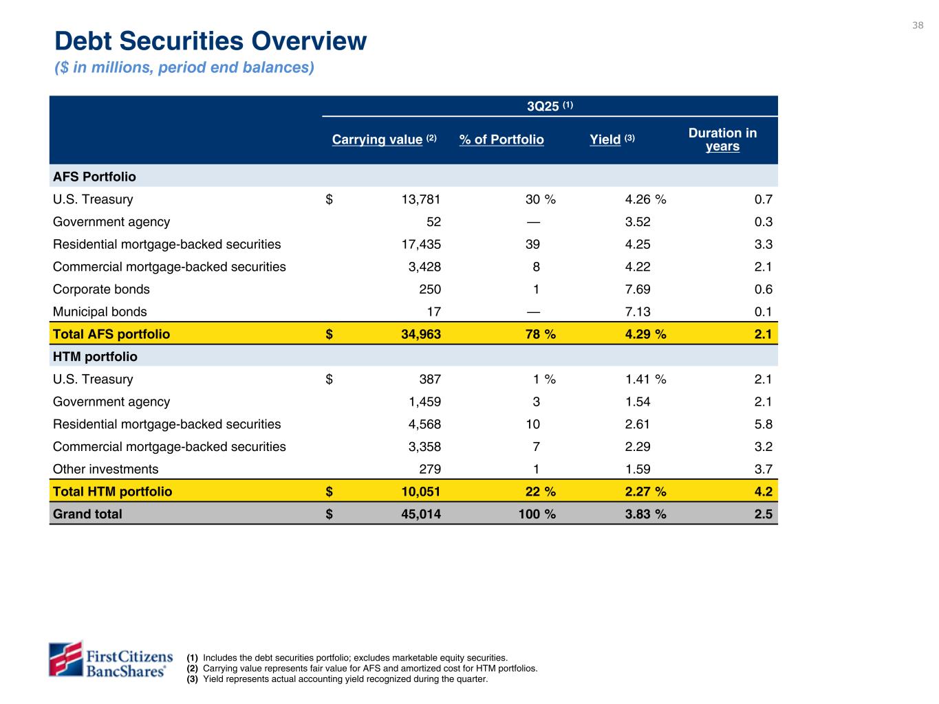 38 (1) 3Q25 (1) Carrying value (2) % of Portfolio Yield (3) Duration in years AFS Portfolio U.S. Treasury $ 13,781 30 % 4.26 % 0.7 Government agency 52 — 3.52 0.3 Residential mortgage-backed securities 17,435 39 4.25 3.3 Commercial mortgage-backed securities 3,428 8 4.22 2.1 Corporate bonds 250 1 7.69 0.6 Municipal bonds 17 — 7.13 0.1 Total AFS portfolio $ 34,963 78 % 4.29 % 2.1 HTM portfolio U.S. Treasury $ 387 1 % 1.41 % 2.1 Government agency 1,459 3 1.54 2.1 Residential mortgage-backed securities 4,568 10 2.61 5.8 Commercial mortgage-backed securities 3,358 7 2.29 3.2 Other investments 279 1 1.59 3.7 Total HTM portfolio $ 10,051 22 % 2.27 % 4.2 Grand total $ 45,014 100 % 3.83 % 2.5 Debt Securities Overview ($ in millions, period end balances) (1) Includes the debt securities portfolio; excludes marketable equity securities. (2) Carrying value represents fair value for AFS and amortized cost for HTM portfolios. (3) Yield represents actual accounting yield recognized during the quarter.