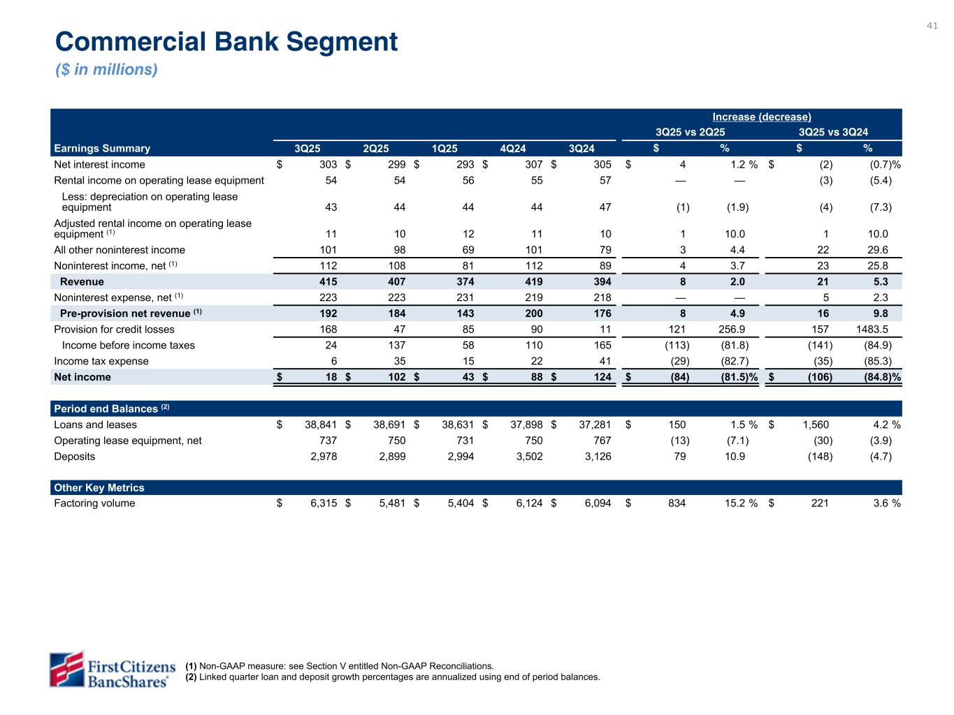 41 Increase (decrease) 3Q25 vs 2Q25 3Q25 vs 3Q24 Earnings Summary 3Q25 2Q25 1Q25 4Q24 3Q24 $ % $ % Net interest income $ 303 $ 299 $ 293 $ 307 $ 305 $ 4 1.2 % $ (2) (0.7) % Rental income on operating lease equipment 54 54 56 55 57 — — (3) (5.4) Less: depreciation on operating lease equipment 43 44 44 44 47 (1) (1.9) (4) (7.3) Adjusted rental income on operating lease equipment (1) 11 10 12 11 10 1 10.0 1 10.0 All other noninterest income 101 98 69 101 79 3 4.4 22 29.6 Noninterest income, net (1) 112 108 81 112 89 4 3.7 23 25.8 Revenue 415 407 374 419 394 8 2.0 21 5.3 Noninterest expense, net (1) 223 223 231 219 218 — — 5 2.3 Pre-provision net revenue (1) 192 184 143 200 176 8 4.9 16 9.8 Provision for credit losses 168 47 85 90 11 121 256.9 157 1483.5 Income before income taxes 24 137 58 110 165 (113) (81.8) (141) (84.9) Income tax expense 6 35 15 22 41 (29) (82.7) (35) (85.3) Net income $ 18 $ 102 $ 43 $ 88 $ 124 $ (84) (81.5) % $ (106) (84.8) % Period end Balances (2) Loans and leases $ 38,841 $ 38,691 $ 38,631 $ 37,898 $ 37,281 $ 150 1.5 % $ 1,560 4.2 % Operating lease equipment, net 737 750 731 750 767 (13) (7.1) (30) (3.9) Deposits 2,978 2,899 2,994 3,502 3,126 79 10.9 (148) (4.7) Other Key Metrics Factoring volume $ 6,315 $ 5,481 $ 5,404 $ 6,124 $ 6,094 $ 834 15.2 % $ 221 3.6 % Highlights • The Commercial Bank segment achieved strong loan growth during the quarter, 6.2% annualized over the linked quarter, largely driven by strong origination volume in our industry verticals. • Factoring volume totaled $6.3 billion, relatively in line with the linked quarter and the prior year quarter. • Segment revenue increased $15 million compared to the linked quarter, primarily driven by higher noninterest income. Commercial Bank Segment ($ in millions) (1) Non-GAAP measure: see Section V entitled Non-GAAP Reconciliations. (2) Linked quarter loan and deposit growth percentages are annualized using end of period balances. Data has not yet been validated but is directional. To be finalized in subsequent draft.