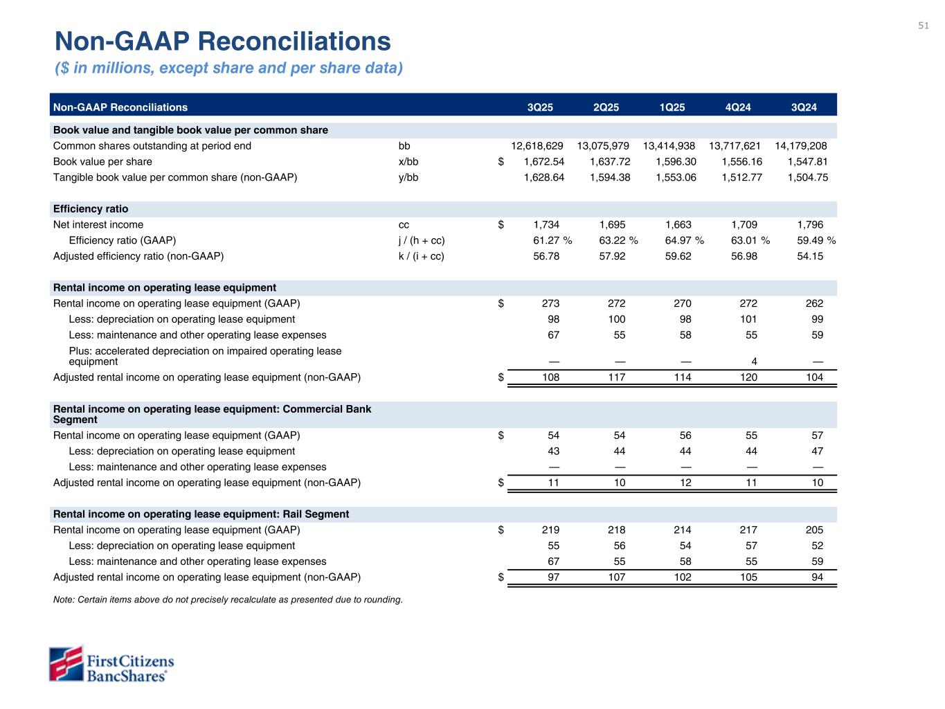 51 Non-GAAP Reconciliations ($ in millions, except share and per share data) Non-GAAP Reconciliations 3Q25 2Q25 1Q25 4Q24 3Q24 Book value and tangible book value per common share Common shares outstanding at period end bb 12,618,629 13,075,979 13,414,938 13,717,621 14,179,208 Book value per share x/bb $ 1,672.54 1,637.72 1,596.30 1,556.16 1,547.81 Tangible book value per common share (non-GAAP) y/bb 1,628.64 1,594.38 1,553.06 1,512.77 1,504.75 Efficiency ratio Net interest income cc $ 1,734 1,695 1,663 1,709 1,796 Efficiency ratio (GAAP) j / (h + cc) 61.27 % 63.22 % 64.97 % 63.01 % 59.49 % Adjusted efficiency ratio (non-GAAP) k / (i + cc) 56.78 57.92 59.62 56.98 54.15 Rental income on operating lease equipment Rental income on operating lease equipment (GAAP) $ 273 272 270 272 262 Less: depreciation on operating lease equipment 98 100 98 101 99 Less: maintenance and other operating lease expenses 67 55 58 55 59 Plus: accelerated depreciation on impaired operating lease equipment — — — 4 — Adjusted rental income on operating lease equipment (non-GAAP) $ 108 117 114 120 104 Rental income on operating lease equipment: Commercial Bank Segment Rental income on operating lease equipment (GAAP) $ 54 54 56 55 57 Less: depreciation on operating lease equipment 43 44 44 44 47 Less: maintenance and other operating lease expenses — — — — — Adjusted rental income on operating lease equipment (non-GAAP) $ 11 10 12 11 10 Rental income on operating lease equipment: Rail Segment Rental income on operating lease equipment (GAAP) $ 219 218 214 217 205 Less: depreciation on operating lease equipment 55 56 54 57 52 Less: maintenance and other operating lease expenses 67 55 58 55 59 Adjusted rental income on operating lease equipment (non-GAAP) $ 97 107 102 105 94 Note: Certain items above do not precisely recalculate as presented due to rounding.