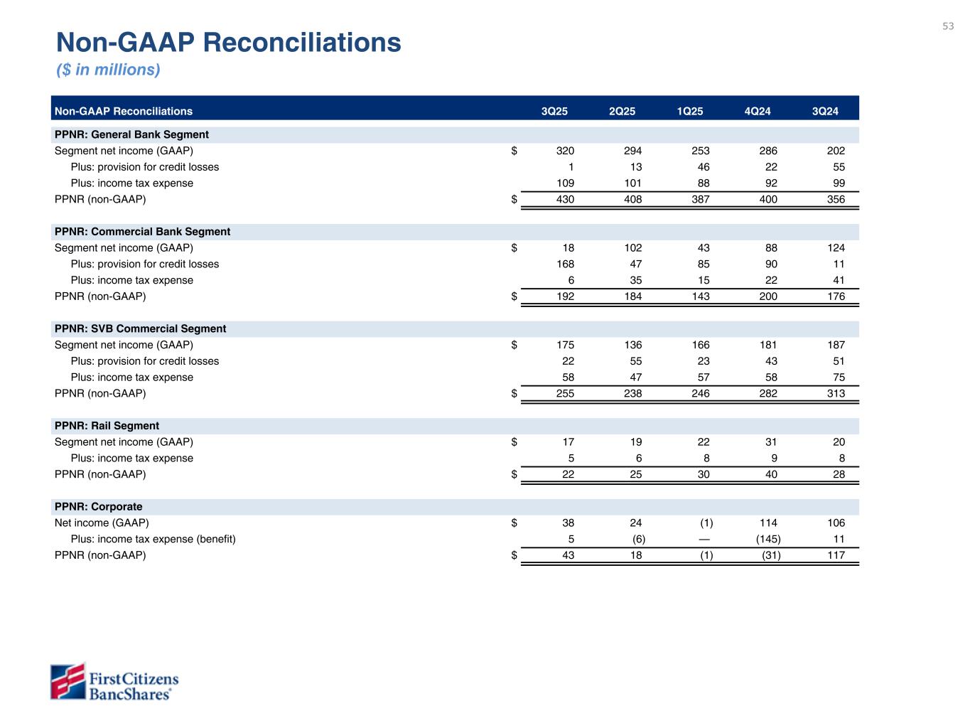 53 Non-GAAP Reconciliations ($ in millions) Non-GAAP Reconciliations 3Q25 2Q25 1Q25 4Q24 3Q24 PPNR: General Bank Segment Segment net income (GAAP) $ 320 294 253 286 202 Plus: provision for credit losses 1 13 46 22 55 Plus: income tax expense 109 101 88 92 99 PPNR (non-GAAP) $ 430 408 387 400 356 PPNR: Commercial Bank Segment Segment net income (GAAP) $ 18 102 43 88 124 Plus: provision for credit losses 168 47 85 90 11 Plus: income tax expense 6 35 15 22 41 PPNR (non-GAAP) $ 192 184 143 200 176 PPNR: SVB Commercial Segment Segment net income (GAAP) $ 175 136 166 181 187 Plus: provision for credit losses 22 55 23 43 51 Plus: income tax expense 58 47 57 58 75 PPNR (non-GAAP) $ 255 238 246 282 313 PPNR: Rail Segment Segment net income (GAAP) $ 17 19 22 31 20 Plus: income tax expense 5 6 8 9 8 PPNR (non-GAAP) $ 22 25 30 40 28 PPNR: Corporate Net income (GAAP) $ 38 24 (1) 114 106 Plus: income tax expense (benefit) 5 (6) — (145) 11 PPNR (non-GAAP) $ 43 18 (1) (31) 117
