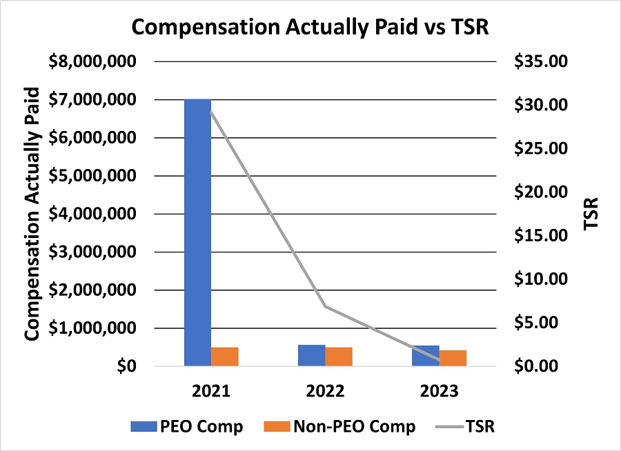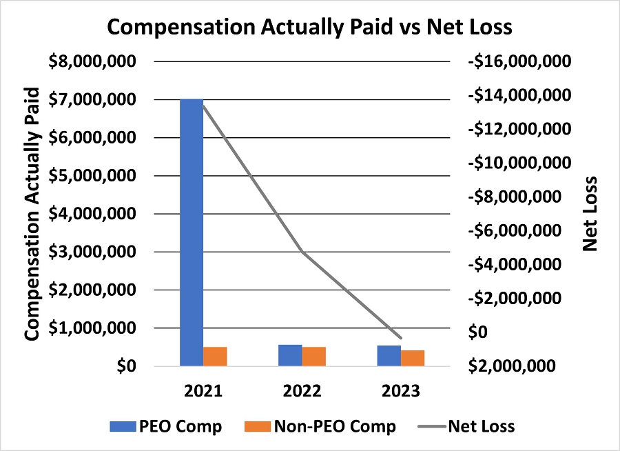 The following table shows the past two fiscal years’ total compensation for our Named Executive Officers as set forth in the Summary Compensation Table (“SCT”), the CAP to our Named Executive Officers (as determined pursuant to SEC rules), our total shareholder return (“TSR”), and our net income (loss). We are a “smaller reporting company,” as defined in Rule 12b-2 under the Exchange Act, and have elected to provide in this Proxy Statement certain scaled disclosures permitted under the Exchange Act for smaller reporting companies.