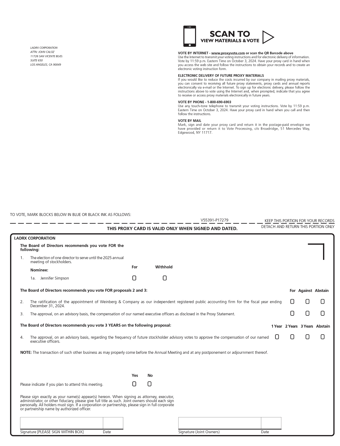 You are cordially invited to attend the 2024 Annual Meeting of Stockholders (the “Annual Meeting”) of LadRx Corporation (the “Company” or “LadRx”). The meeting will be held at 11726 San Vicente Boulevard, Suite 650, Los Angeles, CA 90049 at 10:00 A.M., local time, on Friday, October 4, 2024.