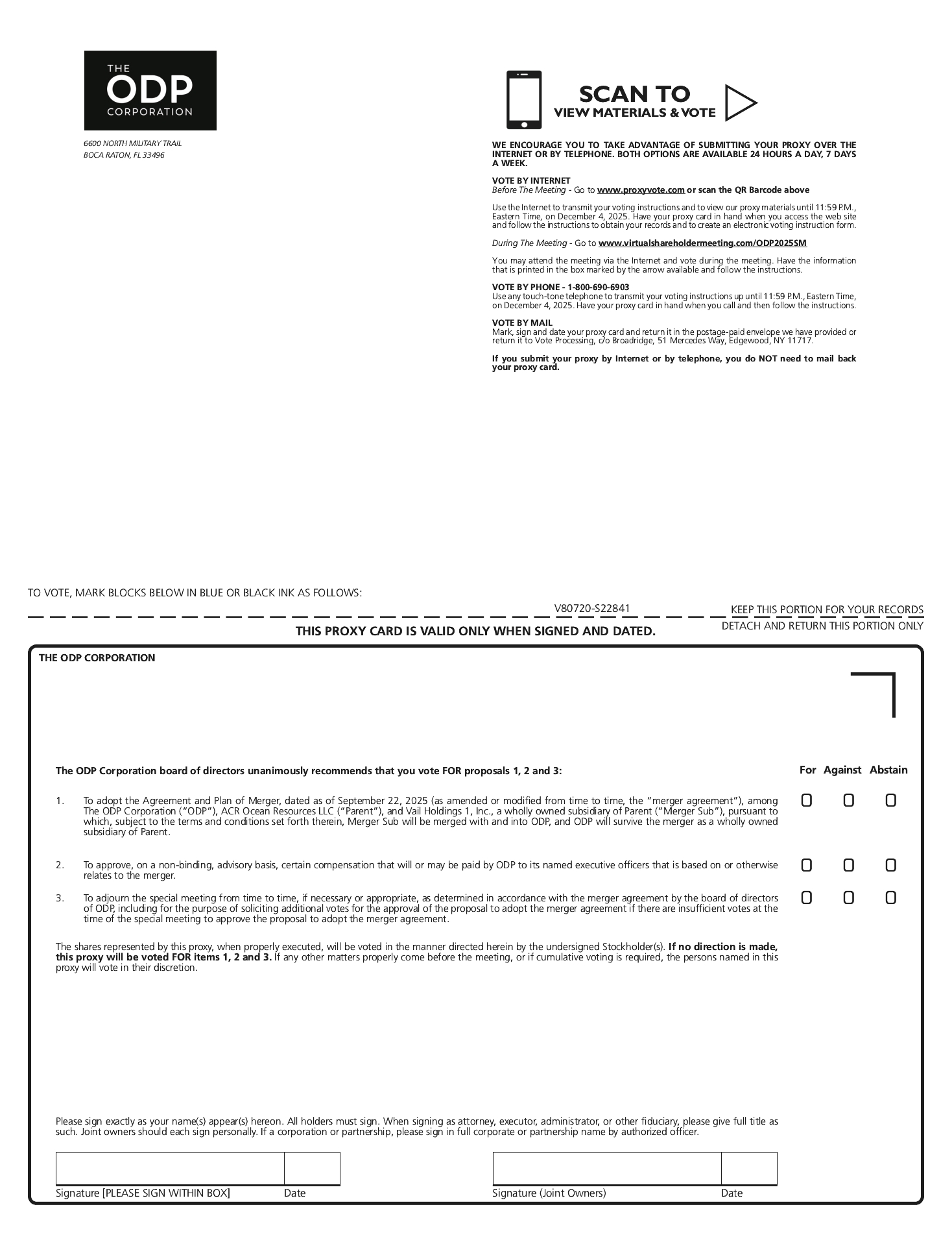 The merger cannot be completed unless ODP stockholders adopt the merger agreement. Your vote is very important, regardless of the number of shares you own. Whether or not you expect to attend the special meeting online, please submit a proxy to vote your shares as promptly as possible to ensure that your shares may be represented and voted at the special meeting. If you receive more than one proxy card because you own shares registered in different names or addresses, each proxy should be submitted. If you attend the special meeting and vote online, your online vote will revoke any proxy previously submitted. If you neither return your proxy nor attend the special meeting online, your shares will not be counted for purposes of determining whether a quorum is present at the special meeting and will have the same effect as a vote “AGAINST” the adoption of the merger agreement. Similarly, if you hold your shares in “street name” and fail to instruct your broker, bank or other nominee how to vote your shares, your shares will not be counted for purposes of determining whether a quorum is present and will have the same effect as a vote “AGAINST” the adoption of the merger agreement.