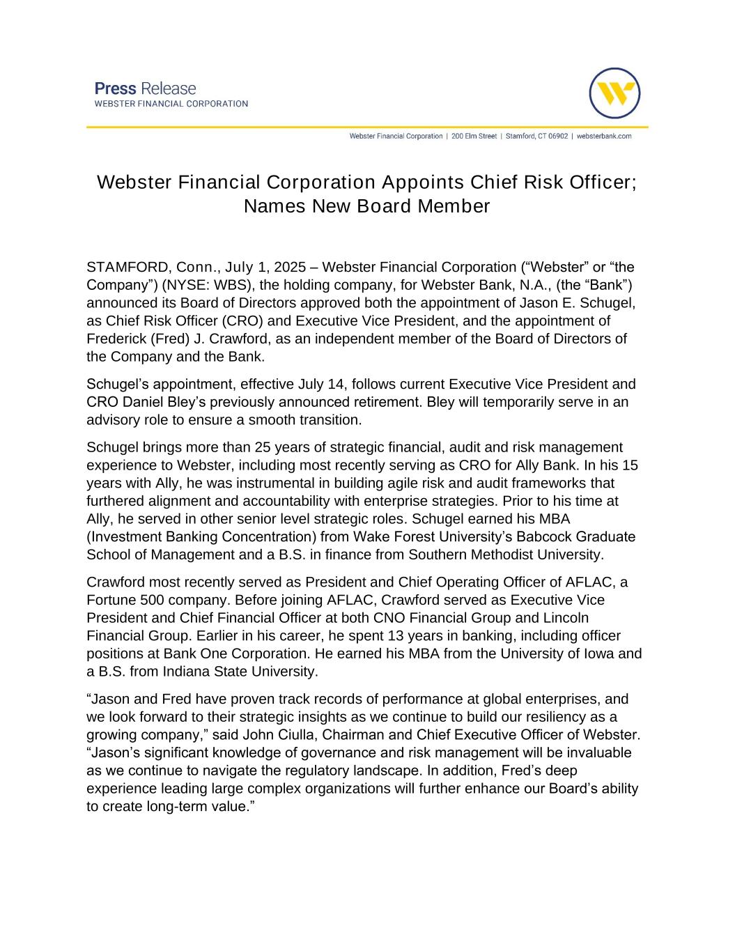 Webster Financial Corporation Appoints Chief Risk Officer; Names New Board Member STAMFORD, Conn., July 1, 2025 – Webster Financial Corporation (“Webster” or “the Company”) (NYSE: WBS), the holding company, for Webster Bank, N.A., (the “Bank”) announced its Board of Directors approved both the appointment of Jason E. Schugel, as Chief Risk Officer (CRO) and Executive Vice President, and the appointment of Frederick (Fred) J. Crawford, as an independent member of the Board of Directors of the Company and the Bank. Schugel’s appointment, effective July 14, follows current Executive Vice President and CRO Daniel Bley’s previously announced retirement. Bley will temporarily serve in an advisory role to ensure a smooth transition. Schugel brings more than 25 years of strategic financial, audit and risk management experience to Webster, including most recently serving as CRO for Ally Bank. In his 15 years with Ally, he was instrumental in building agile risk and audit frameworks that furthered alignment and accountability with enterprise strategies. Prior to his time at Ally, he served in other senior level strategic roles. Schugel earned his MBA (Investment Banking Concentration) from Wake Forest University’s Babcock Graduate School of Management and a B.S. in finance from Southern Methodist University. Crawford most recently served as President and Chief Operating Officer of AFLAC, a Fortune 500 company. Before joining AFLAC, Crawford served as Executive Vice President and Chief Financial Officer at both CNO Financial Group and Lincoln Financial Group. Earlier in his career, he spent 13 years in banking, including officer positions at Bank One Corporation. He earned his MBA from the University of Iowa and a B.S. from Indiana State University. “Jason and Fred have proven track records of performance at global enterprises, and we look forward to their strategic insights as we continue to build our resiliency as a growing company,” said John Ciulla, Chairman and Chief Executive Officer of Webster. “Jason’s significant knowledge of governance and risk management will be invaluable as we continue to navigate the regulatory landscape. In addition, Fred’s deep experience leading large complex organizations will further enhance our Board’s ability to create long-term value.”