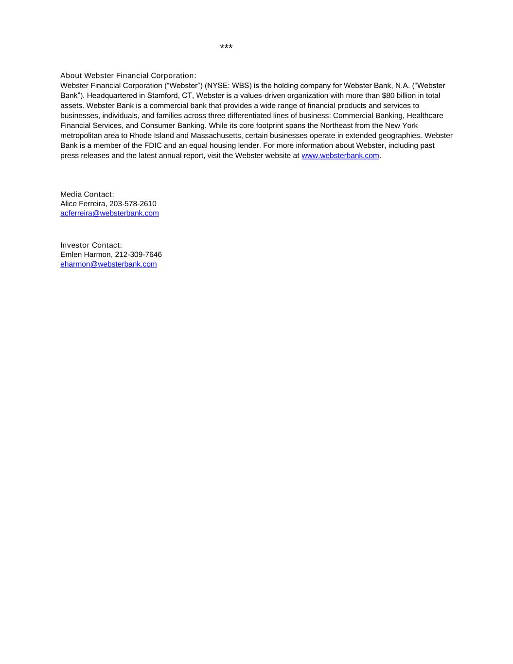 *** About Webster Financial Corporation: Webster Financial Corporation (“Webster”) (NYSE: WBS) is the holding company for Webster Bank, N.A. (“Webster Bank”). Headquartered in Stamford, CT, Webster is a values-driven organization with more than $80 billion in total assets. Webster Bank is a commercial bank that provides a wide range of financial products and services to businesses, individuals, and families across three differentiated lines of business: Commercial Banking, Healthcare Financial Services, and Consumer Banking. While its core footprint spans the Northeast from the New York metropolitan area to Rhode Island and Massachusetts, certain businesses operate in extended geographies. Webster Bank is a member of the FDIC and an equal housing lender. For more information about Webster, including past press releases and the latest annual report, visit the Webster website at www.websterbank.com. Media Contact: Alice Ferreira, 203-578-2610 acferreira@websterbank.com Investor Contact: Emlen Harmon, 212-309-7646 eharmon@websterbank.com