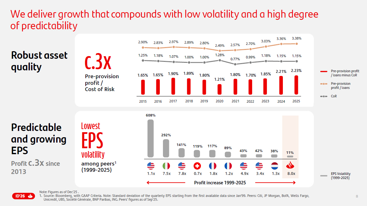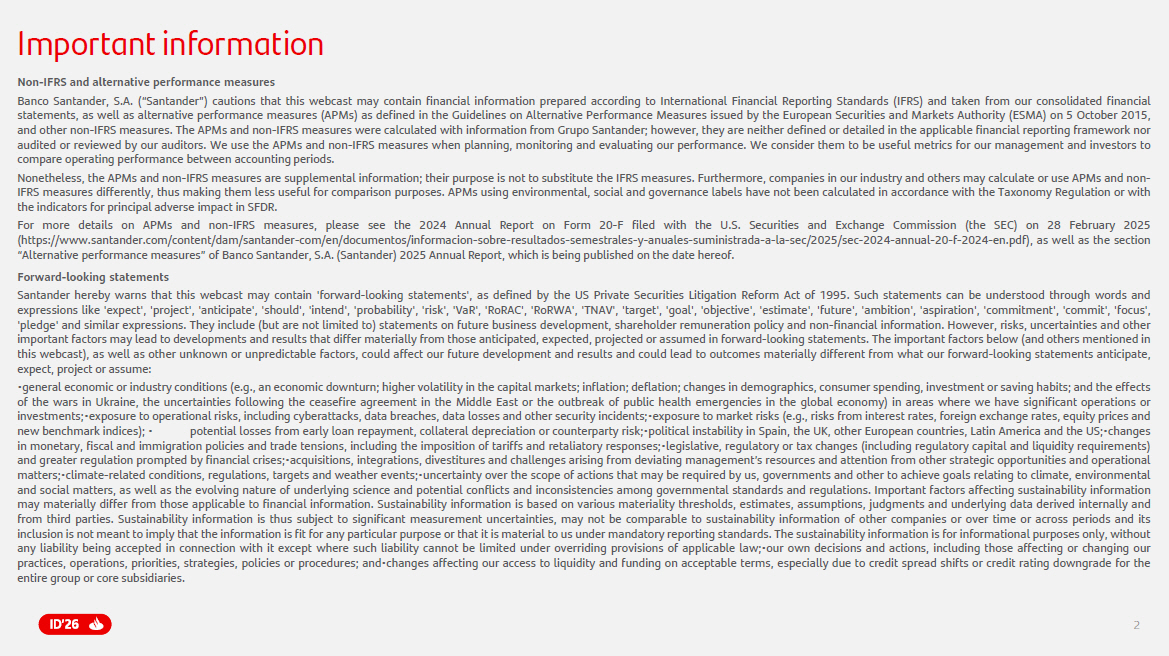 2 Important information Non - IFRS and alternative performance measures Banco Santander, S . A . (“Santander”) cautions that this webcast may contain financial information prepared according to International Financial Reporting Standards (IFRS) and taken from our consolidated financial statements, as well as alternative performance measures (APMs) as defined in the Guidelines on Alternative Performance Measures issued by the European Securities and Markets Authority (ESMA) on 5 October 2015 , and other non - IFRS measures . The APMs and non - IFRS measures were calculated with information from Grupo Santander ; however, they are neither defined or detailed in the applicable financial reporting framework nor audited or reviewed by our auditors . We use the APMs and non - IFRS measures when planning, monitoring and evaluating our performance . We consider them to be useful metrics for our management and investors to compare operating performance between accounting periods . Nonetheless, the APMs and non - IFRS measures are supplemental information ; their purpose is not to substitute the IFRS measures . Furthermore, companies in our industry and others may calculate or use APMs and non - IFRS measures differently, thus making them less useful for comparison purposes . APMs using environmental, social and governance labels have not been calculated in accordance with the Taxonomy Regulation or with the indicators for principal adverse impact in SFDR . For more details on APMs and non - IFRS measures, please see the 2024 Annual Report on Form 20 - F filed with the U . S . Securities and Exchange Commission (the SEC) on 28 February 2025 (https : //www . santander . com/content/dam/santander - com/en/documentos/informacion - sobre - resultados - semestrales - y - anuales - suministrada - a - la - sec/ 2025 /sec - 2024 - annual - 20 - f - 2024 - en . pdf), as well as the section “Alternative performance measures” of Banco Santander, S . A . (Santander) 2025 Annual Report, which is being published on the date hereof . Forward - looking statements Santander hereby warns that this webcast may contain 'forward - looking statements', as defined by the US Private Securities Litigation Reform Act of 1995 . Such statements can be understood through words and expressions like 'expect', 'project', 'anticipate', 'should', 'intend', 'probability', 'risk', 'VaR', 'RoRAC', 'RoRWA', 'TNAV', 'target', 'goal', 'objective', 'estimate', 'future', 'ambition', 'aspiration', 'commitment', 'commit', 'focus', 'pledge' and similar expressions . They include (but are not limited to) statements on future business development, shareholder remuneration policy and non - financial information . However, risks, uncertainties and other important factors may lead to developments and results that differ materially from those anticipated, expected, projected or assumed in forward - looking statements . The important factors below (and others mentioned in this webcast), as well as other unknown or unpredictable factors, could affect our future development and results and could lead to outcomes materially different from what our forward - looking statements anticipate, expect, project or assume : • general economic or industry conditions (e . g . , an economic downturn ; higher volatility in the capital markets ; inflation ; deflation ; changes in demographics, consumer spending, investment or saving habits ; and the effects of the wars in Ukraine, the uncertainties following the ceasefire agreement in the Middle East or the outbreak of public health emergencies in the global economy) in areas where we have significant operations or investments ;• exposure to operational risks, including cyberattacks, data breaches, data losses and other security incidents ;• exposure to market risks (e . g . , risks from interest rates, foreign exchange rates, equity prices and new benchmark indices) ; • potential losses from early loan repayment, collateral depreciation or counterparty risk ;• political instability in Spain, the UK, other European countries, Latin America and the US ;• changes in monetary, fiscal and immigration policies and trade tensions, including the imposition of tariffs and retaliatory responses ;• legislative, regulatory or tax changes (including regulatory capital and liquidity requirements) and greater regulation prompted by financial crises ;• acquisitions, integrations, divestitures and challenges arising from deviating management’s resources and attention from other strategic opportunities and operational matters ;• climate - related conditions, regulations, targets and weather events ;• uncertainty over the scope of actions that may be required by us, governments and other to achieve goals relating to climate, environmental and social matters, as well as the evolving nature of underlying science and potential conflicts and inconsistencies among governmental standards and regulations . Important factors affecting sustainability information may materially differ from those applicable to financial information . Sustainability information is based on various materiality thresholds, estimates, assumptions, judgments and underlying data derived internally and from third parties . Sustainability information is thus subject to significant measurement uncertainties, may not be comparable to sustainability information of other companies or over time or across periods and its inclusion is not meant to imply that the information is fit for any particular purpose or that it is material to us under mandatory reporting standards . The sustainability information is for informational purposes only, without any liability being accepted in connection with it except where such liability cannot be limited under overriding provisions of applicable law ;• our own decisions and actions, including those affecting or changing our practices, operations, priorities, strategies, policies or procedures ; and • cha