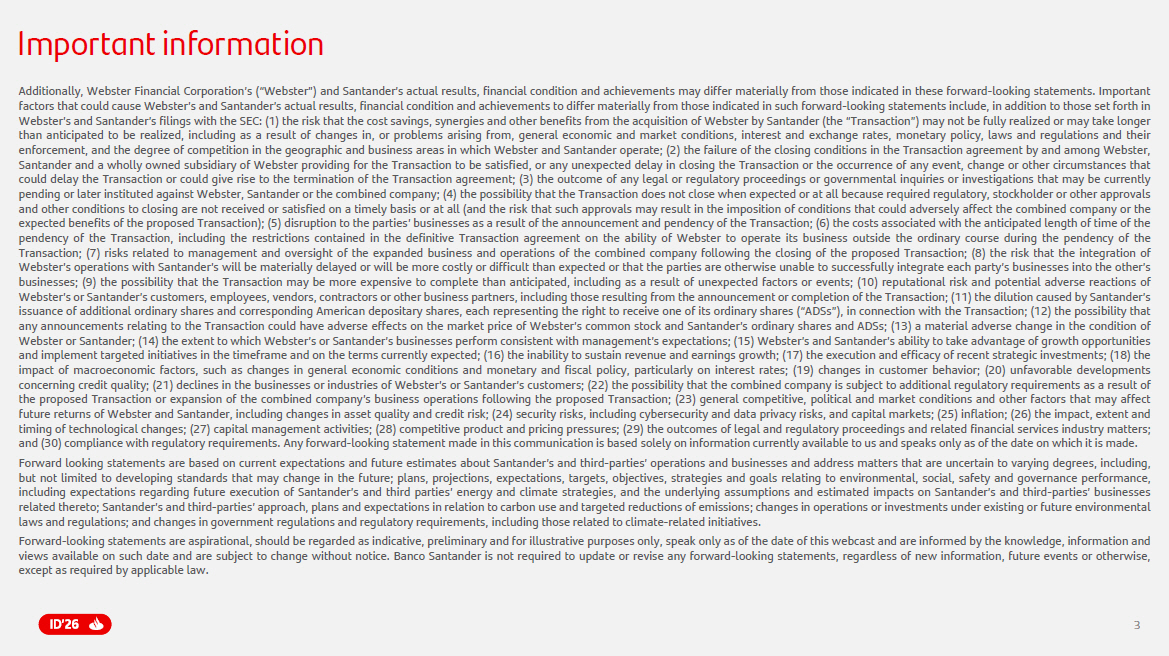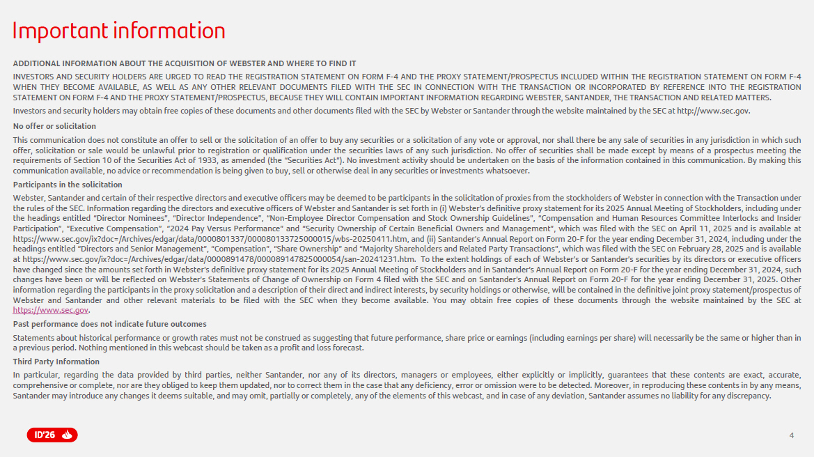 4 4 Important information ADDITIONAL INFORMATION ABOUT THE ACQUISITION OF WEBSTER AND WHERE TO FIND IT INVESTORS AND SECURITY HOLDERS ARE URGED TO READ THE REGISTRATION STATEMENT ON FORM F - 4 AND THE PROXY STATEMENT/PROSPECTUS INCLUDED WITHIN THE REGISTRATION STATEMENT ON FORM F - 4 WHEN THEY BECOME AVAILABLE, AS WELL AS ANY OTHER RELEVANT DOCUMENTS FILED WITH THE SEC IN CONNECTION WITH THE TRANSACTION OR INCORPORATED BY REFERENCE INTO THE REGISTRATION STATEMENT ON FORM F - 4 AND THE PROXY STATEMENT/PROSPECTUS, BECAUSE THEY WILL CONTAIN IMPORTANT INFORMATION REGARDING WEBSTER, SANTANDER, THE TRANSACTION AND RELATED MATTERS . Investors and security holders may obtain free copies of these documents and other documents filed with the SEC by Webster or Santander through the website maintained by the SEC at http : //www . sec . gov . No offer or solicitation This communication does not constitute an offer to sell or the solicitation of an offer to buy any securities or a solicitation of any vote or approval, nor shall there be any sale of securities in any jurisdiction in which such offer, solicitation or sale would be unlawful prior to registration or qualification under the securities laws of any such jurisdiction . No offer of securities shall be made except by means of a prospectus meeting the requirements of Section 10 of the Securities Act of 1933 , as amended (the “Securities Act”) . No investment activity should be undertaken on the basis of the information contained in this communication . By making this communication available, no advice or recommendation is being given to buy, sell or otherwise deal in any securities or investments whatsoever . Participants in the solicitation Webster, Santander and certain of their respective directors and executive officers may be deemed to be participants in the solicitation of proxies from the stockholders of Webster in connection with the Transaction under the rules of the SEC . Information regarding the directors and executive officers of Webster and Santander is set forth in (i) Webster’s definitive proxy statement for its 2025 Annual Meeting of Stockholders, including under the headings entitled “Director Nominees”, “Director Independence”, “Non - Employee Director Compensation and Stock Ownership Guidelines”, “Compensation and Human Resources Committee Interlocks and Insider Participation”, “Executive Compensation”, “ 2024 Pay Versus Performance” and “Security Ownership of Certain Beneficial Owners and Management”, which was filed with the SEC on April 11 , 2025 and is available at https : //www . sec . gov/ix?doc=/Archives/edgar/data/ 0000801337 / 000080133725000015 /wbs - 20250411 . htm, and (ii) Santander’s Annual Report on Form 20 - F for the year ending December 31 , 2024 , including under the headings entitled “Directors and Senior Management”, “Compensation”, “Share Ownership” and “Majority Shareholders and Related Party Transactions”, which was filed with the SEC on February 28 , 2025 and is available at https : //www . sec . gov/ix?doc=/Archives/edgar/data/ 0000891478 / 000089147825000054 /san - 20241231 . htm . To the extent holdings of each of Webster’s or Santander’s securities by its directors or executive officers have changed since the amounts set forth in Webster’s definitive proxy statement for its 2025 Annual Meeting of Stockholders and in Santander’s Annual Report on Form 20 - F for the year ending December 31 , 2024 , such changes have been or will be reflected on Webster’s Statements of Change of Ownership on Form 4 filed with the SEC and on Santander’s Annual Report on Form 20 - F for the year ending December 31 , 2025 . Other information regarding the participants in the proxy solicitation and a description of their direct and indirect interests, by security holdings or otherwise, will be contained in the definitive joint proxy statement/prospectus of Webster and Santander and other relevant materials to be filed with the SEC when they become available . You may obtain free copies of these documents through the website maintained by the SEC at https : //www . sec . gov . Past performance does not indicate future outcomes Statements about historical performance or growth rates must not be construed as suggesting that future performance, share price or earnings (including earnings per share) will necessarily be the same or higher than in a previous period . Nothing mentioned in this webcast should be taken as a profit and loss forecast . Third Party Information In particular, regarding the data provided by third parties, neither Santander, nor any of its directors, managers or employees, either explicitly or implicitly, guarantees that these contents are exact, accurate, comprehensive or complete, nor are they obliged to keep them updated, nor to correct them in the case that any deficiency, error or omission were to be detected . Moreover, in reproducing these contents in by any means, Santander may introduce any changes it deems suitable, and may omit, partially or completely, any of the elements of this webcast, and in case of any deviation, Santander assumes no liability for any discrepancy .
