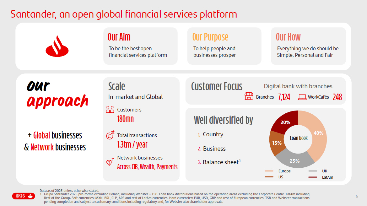 6 Our Aim To be the best open financial services platform Everything we do should be Simple, Personal and Fair Our Purpose To he l p p e op l e and busin e ss e s p r o s p e r Our How Our approac h Digital bank with branches In - market and Global 180 mn Customers 1.3 tr n / year Total transactions Network businesses Across CIB, Wealth, Payments Country 1. Business 2. Balance sheet 1 3. Branches WorkCafés 7,124 248 + Global businesses & Network businesses Customer Focus Scal e Well d iversified by 40% 25% 15% 20% Loan book Europe UK US LatAm Santander, an open global financial services platform Data as of 2025 unless otherwise stated . 1. Grupo Santander 2025 pro - forma excluding Poland, including Webster + TSB . Loan book distributions based on the operating areas excluding the Corporate Centre . LatAm including Rest of the Group . Soft currencies : MXN, BRL, CLP, ARS and rest of LatAm currencies . Hard currencies : EUR, USD, GBP and rest of European currencies . TSB and Webster transactions pending completion and subject to customary conditions including regulatory and, for Webster also shareholder approvals .