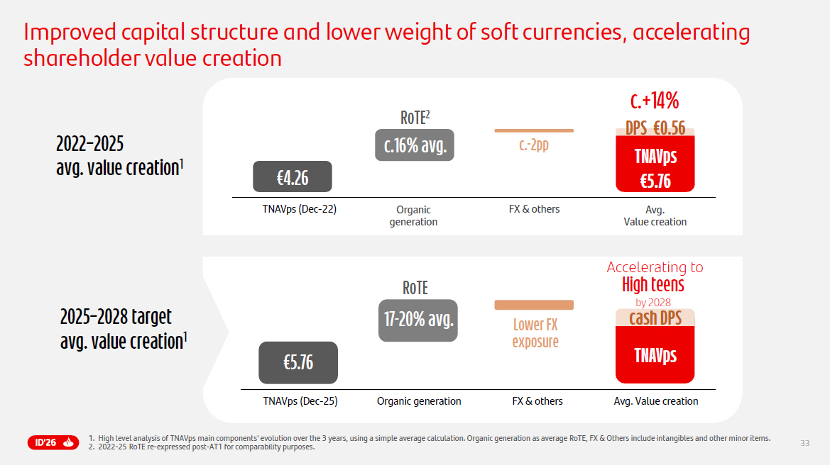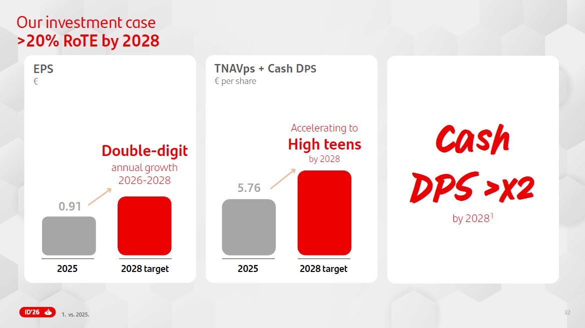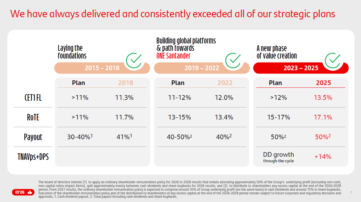 7 13.5% >12% 17.1% 15 - 17% 50% 2 50% 2 +14% DD growth through - the - cycle 2023 – 2025 12.0% 11 - 12% 13.4% 13 - 15% 40% 2 40 - 50% 2 2019 – 2022 11.3% >11% 11.7% >11% 41% 1 30 - 40% 1 2015 – 2018 CET1 FL RoTE Payout TNAVps +DPS Plan 2018 Plan 2022 Plan 2025 Laying the foundation s Building global platforms & path towards ONE Santander A new phase of value creation We have always delivered and consistently exceeded all of our strategic plans The board of directors intends ( 1 ) to apply an ordinary shareholder remuneration policy for 2026 to 2028 results that entails allocating approximately 50 % of the Group’s underlying profit (excluding non - cash, non - capital ratios impact items), split approximately evenly between cash dividends and share buybacks for 2026 results, and ( 2 ) to distribute to shareholders any excess capital at the end of the 2026 - 2028 period . From 2027 results, the ordinary shareholder remuneration policy is expected to comprise around 35 % of Group underlying profit (on the same basis) in cash dividends and around 15 % in share buybacks . Execution of the shareholder remuneration policy and of the distribution to shareholders of any excess capital at the end of the 2026 - 2028 period remain subject to future corporate and regulatory decisions and approvals . 1 . Cash dividend payout . 2 . Total payout Including cash dividends and share buybacks .