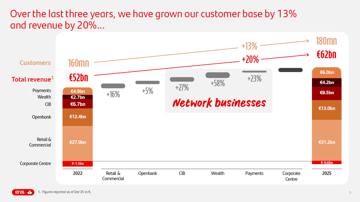 9 Over the last three years, we have grown our customer base by 13% and revenue by 20%... 1. Figures reported as of Dec’ 25 in € . €52bn Customers 160 mn 180m n Retail & Commercial Openbank CIB Wealth Payments €27.0bn €12.4bn € 6.7 bn €2.7bn €4.9bn 2022 2025 €62bn €31.2bn €13.0bn €8.5bn €4.2bn €6.0bn +23% +58% +27% +5% +16% Total revenue 1 Network businesses R etail & Commercial Openbank CIB Wealth Payments +20 % +13 % € - 1.5bn € - 0.6bn Corporate Centre Corporate Centre
